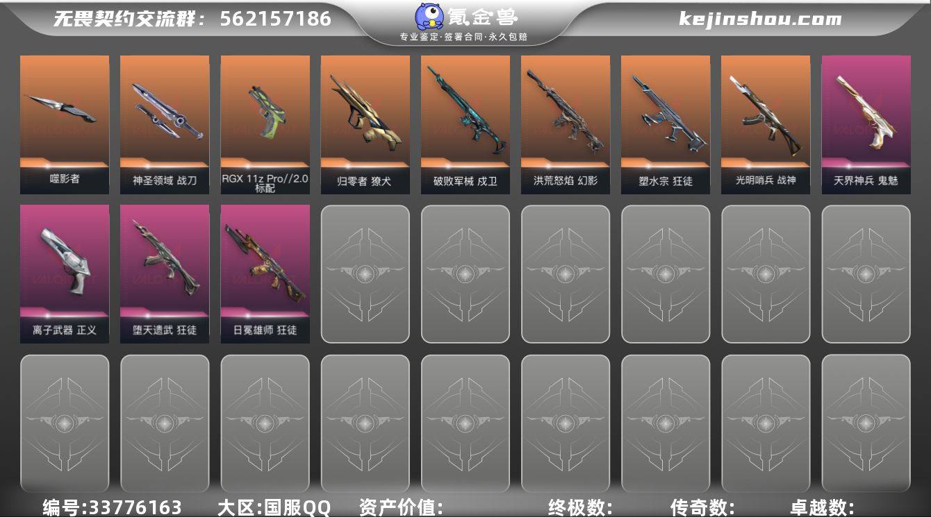 【套装】:2025全球冠军赛套装,2022全球冠军赛套装,无畏契约季前邀请赛套装 【英雄】:幻棱,炼狱,维斯,暮蝶,钛狐,壹决,铁臂,捷风,雷兹,幽影,不死鸟,贤者,猎枭,蝰蛇,零,芮娜,奇乐,尚勃勒,霓虹,斯凯,夜露,星礈,K/O,海神,盖可,黑梦,钢锁 【近战武器】:近战武器-2025全球冠军赛 蝴蝶刀,近战武器-2022全球冠军赛 蝴蝶刀,近战武器-蒙太奇 战斧,近战武器-无畏契约季前邀请赛 悲悯之刃,近战武器-噬影者 簇刃,近战武器-诡秘蛇影 军刀,近战武器-神圣领域 战刀,近战武器-阿特拉斯指挥部 甩棍 【狂徒】:狂徒-2025全球冠军赛,狂徒-塑水宗,狂徒-RGX 11z Pro,狂徒-光荣异象,狂徒-堕天遗武,狂徒-日冕雄师,狂徒-诡秘蛇影 【幻影】:幻影-2022全球冠军赛,幻影-洪荒怒焰,幻影-混沌序曲//2.0,幻影-神圣领域,幻影-蒙太奇,幻影-末日之翼 【戍卫】:戍卫-破败军械,戍卫-月球哨兵,戍卫-折光棱晶 【獠犬】:獠犬-归零者,獠犬-神圣领域 【冥驹】:冥驹-星云暗涌 【飞将】:飞将-末日之翼 【莽侠】:莽侠-诡秘蛇影,莽侠-月球哨兵 【战神】:战神-光明哨兵,战神-神圣领域,战神-蒙太奇 【奥丁】:奥丁-末日之翼 【判官】:判官-诡秘蛇影 【雄鹿】:...