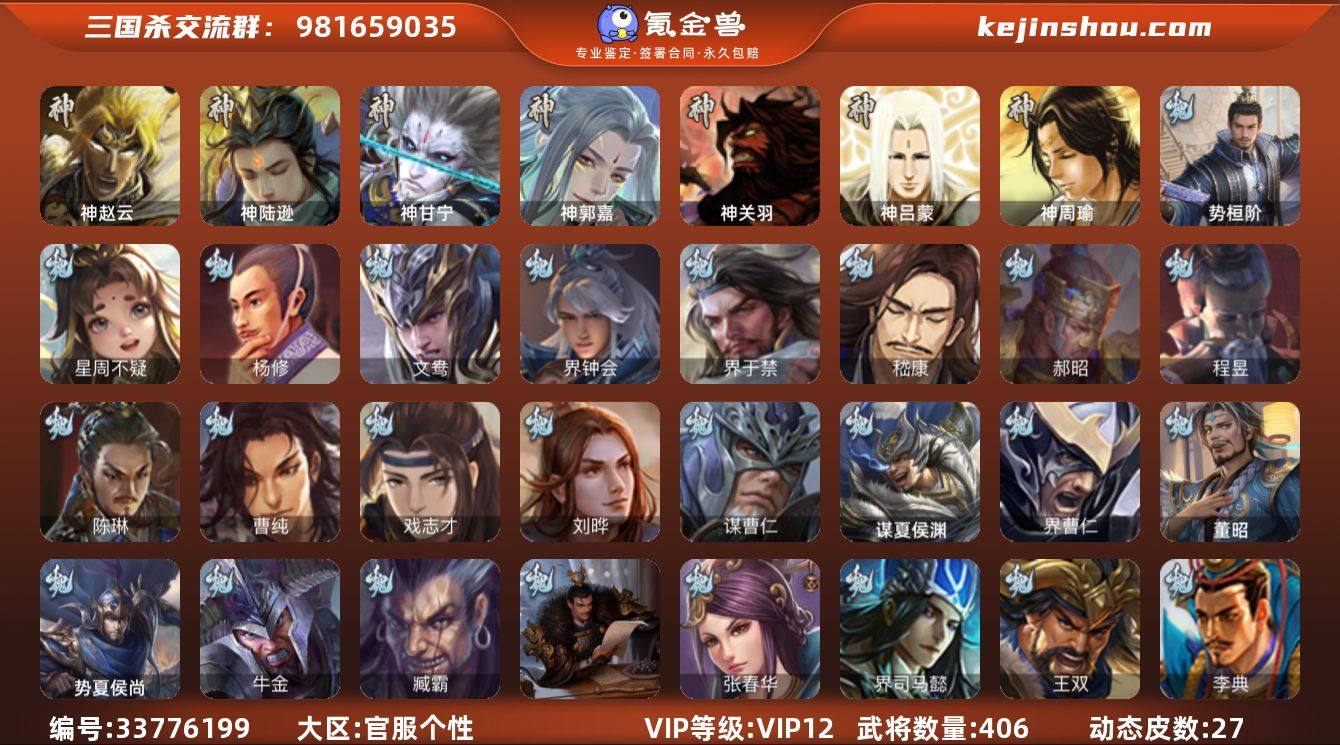 官阶:大将军;VIP等级:VIP12;史诗武将数量:52;动态皮肤数量:27;武将总数:406;史诗宝珠数量:0;将魂数量:236;神将:4;魏国史诗武将:10;蜀国史诗武将:12;吴国史诗武将:7;群史诗武将:17