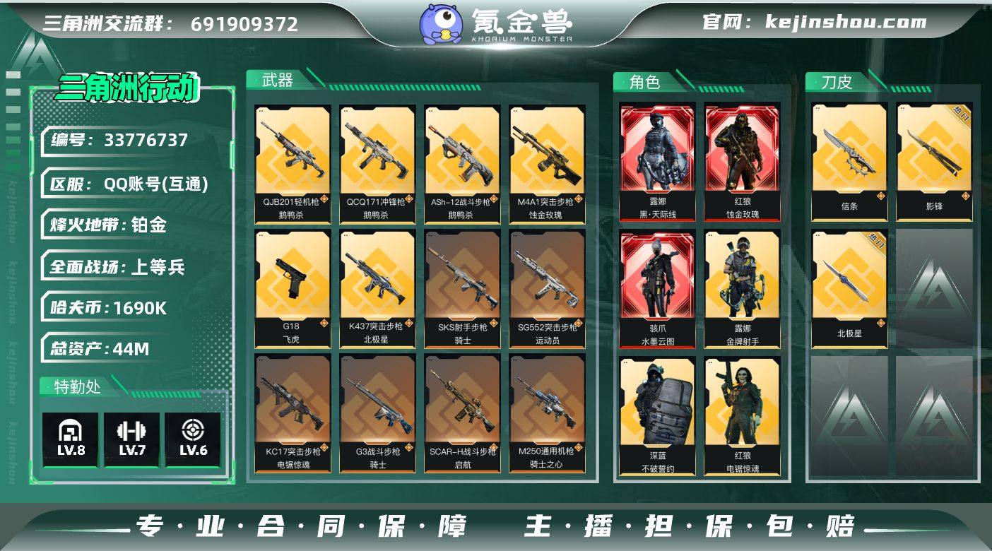 【935462】44m总资产-1690k哈伏币-60烽火等级-铂金-50战场等级-上等兵 【干员外观】:红狼-蚀金玫瑰,骇爪-水墨云图,露娜-黑·天际线,威龙-飞虎,蜂医-送葬人·无题密令,无名-夜鹰,深蓝-不破誓约,红狼-电锯惊魂,露娜-金牌射手 【近战皮肤】:近战-北极星,近战-信条,近战-影锋,近战-黑鹰 【传说外观】:M4A1突击步枪-蚀金玫瑰,M4A1突击步枪-阿米娅,ASh-12战斗步枪-鹅鸭杀,SG552突击步枪-运动员,AK-12突击步枪-夜鹰,AK-12突击步枪-特斯拉线圈,SCAR-H战斗步枪-水墨云图,SCAR-H战斗步枪-启航,G3战斗步枪-骑士,腾龙突击步枪-捞点薯条,K437突击步枪-北极星,KC17突击步枪-电锯惊魂,UZI冲锋枪-特斯拉线圈,SMG-45冲锋枪-骑士,SR-3M紧凑突击步枪-特斯拉线圈,勇士冲锋枪-能天使-午夜邮差,QCQ171冲锋枪-鹅鸭杀,725双管霰弹枪-送葬人-无题密令,M250通用机枪-骑士之心,QJB201轻机枪-鹅鸭杀,SKS射手步枪-骑士,AWM狙击步枪-捞点薯条,G18-飞虎,93R-捞点薯条,复合弓-黑·天际线 【史诗外观】:AKM突击步枪-林中猎手,QBZ95-1突击步枪-曙光,ASh-12战斗步枪-守夜人,ASh-12战斗步枪-无极限,K416突击步枪-冬日风情,M16A4突击步枪-竞赛选手,AUG突击步枪-蝮蛇,M7...