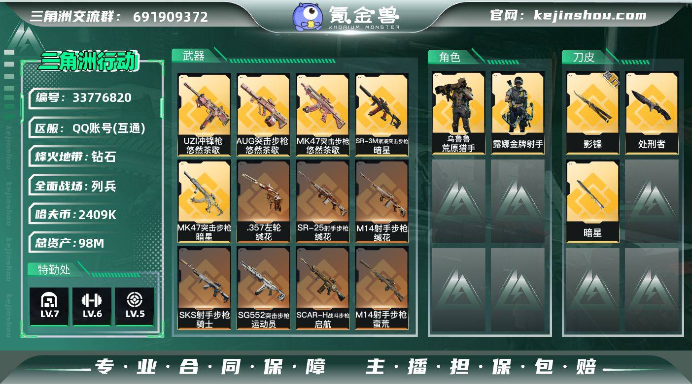 【945740】【近战-暗星,近战-影锋】98m总资产-2409k哈夫币-60烽火等级-钻石-17战场等级-列兵 【干员外观】:露娜-金牌射手,乌鲁鲁-荒原猎手 【近战皮肤】:近战-暗星,近战-影锋,近战-处刑者1级,近战-黑鹰 【传说外观】:AUG突击步枪-悠然茶歇,SG552突击步枪-运动员,SCAR-H战斗步枪-启航,MK47突击步枪-悠然茶歇,MK47突击步枪-暗星,UZI冲锋枪-悠然茶歇,SR-3M紧凑突击步枪-暗星,M14射手步枪-蛮荒,M14射手步枪-缄花,SKS射手步枪-骑士,SR-25射手步枪-缄花,.357左轮-缄花 【史诗外观】:K416突击步枪-冬日风情,K416突击步枪-腊梅,AUG突击步枪-蝮蛇,M7战斗步枪-百步穿杨,SG552突击步枪-哈夫克警备,SCAR-H战斗步枪-囚徒,G3战斗步枪-流沙送葬,G3战斗步枪-哈夫克警备,AS Val突击步枪-百步穿杨,K437突击步枪-丛影谍踪,MP5冲锋枪-深海恐惧,MP5冲锋枪-战术竞备,MP5冲锋枪-竞技风,Vector冲锋枪-猎鳄行动,Vector冲锋枪-百步穿杨,SR-3M紧凑突击步枪-开工大吉,勇士冲锋枪-丛影谍踪,MP7冲锋枪-六套之力,S12K霰弹枪-曙光,M249轻机枪-丛影谍踪,QJB201轻机枪-炽焰,VSS射手步枪-丛影谍踪,SVD狙击步枪-阿萨拉工艺,SV-98狙击步枪-囚徒,SV-98狙击步枪-猎鳄行动...