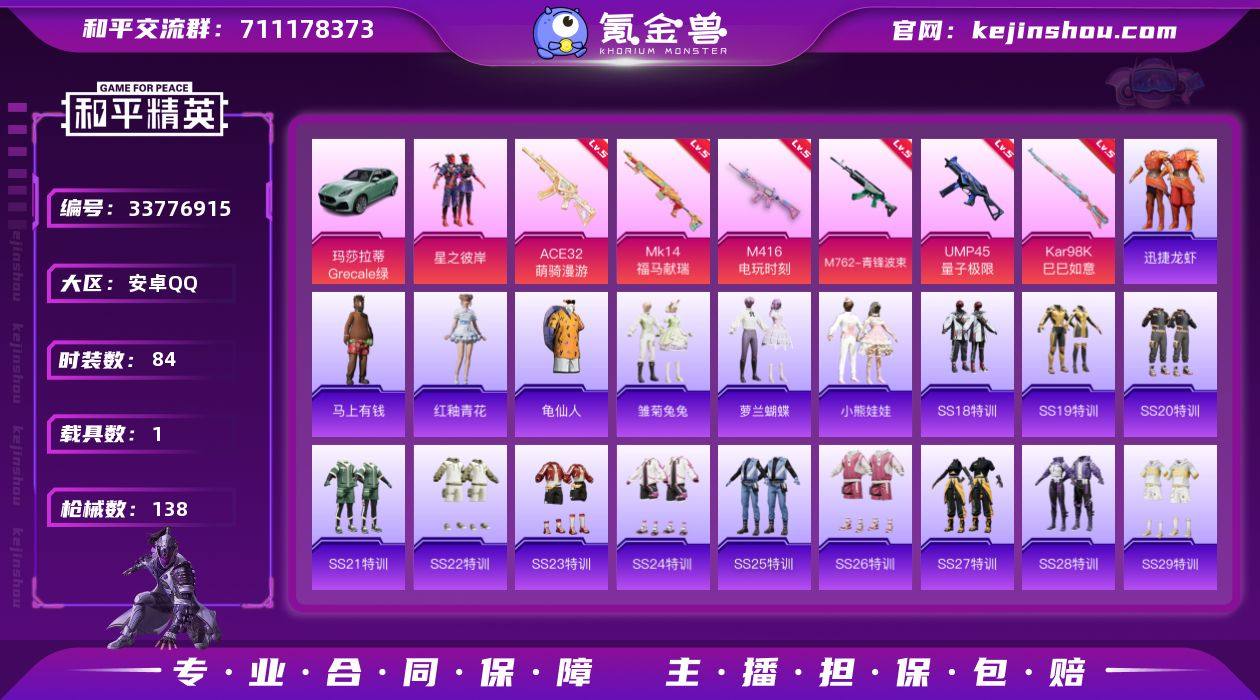 YXc29164-【无二次协助处理】【因赛季更新游戏段付以上号为准!】 安卓Q-1载具1粉装6特效枪5热门84套装138枪皮 8印记 历史卓越王牌6星 【1载具】 玛莎拉蒂G绿色 【1粉装】 星之彼岸 【6特效枪】 M416-电玩时刻 (5级) Kar98K-巳巳如意 (5级) M762-青锋波束 (5级) UMP45-量子极限 (5级) Mk14-福马献瑞 (5级) ACE32-萌骑漫游 (5级) 【5热门】 龟仙人 漫步者 静谧青瓷 破蛋小黄鸡 风华少年志