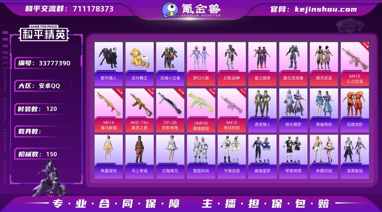 【961153】安卓 手Q-5粉装-6特效枪-0载具-2粉色飞行器-44934热力值-8王牌印记-120套装-150枪皮 【热门品类】:粉装-梦幻火箭,套装-浪漫天命,套装-都市猎人,套装-派对舞王,套装-深海小丑鱼,套装-暗影哥特,角色-Mark.06 【粉色套装】:粉装-幻影战神,粉装-梦幻火箭,粉装-星之彼岸,角色-复仇流浪者,粉装-朗月武圣 【粉色枪皮等级】:M416-心之恋语(六级),M416-电玩时刻(一级),UMP45-萌骑冒险(四级),AKS-74U-森灵之息(五级),Mk14-福马献瑞(五级),DP-28-豹影疾电(五级) 【粉色枪皮】:M416-心之恋语,M416-电玩时刻,UMP45-萌骑冒险,AKS-74U-森灵之息,Mk14-福马献瑞,DP-28-豹影疾电 【粉色飞行器】:炫彩糖果飞行器,梦幻火箭飞行器 【粉色降落伞】:幻影战神降落伞,梦幻火箭降落伞,星之彼岸降落伞,荧海星豚降落伞,炫彩糖果降落伞 【稀有套装】:套装-雪国风尚,套装-炫彩糖果,套装-马上有钱,套装-迅捷龙虾,套装-遗迹猎人,套装-彩虹兔,套装-云朵鹅,套装-雪绒豹,套装-混沌火种,角色-时希公主,套装-朱霞炽焰,套装-凌霄紫焰,套装-擎苍青焰,套装-书海巡游,套装-画境星梦,套装-琴音绮想,套装-雨过天青,套装-红釉青花,角色-枫露凝珀,套装-锦灰蝶...