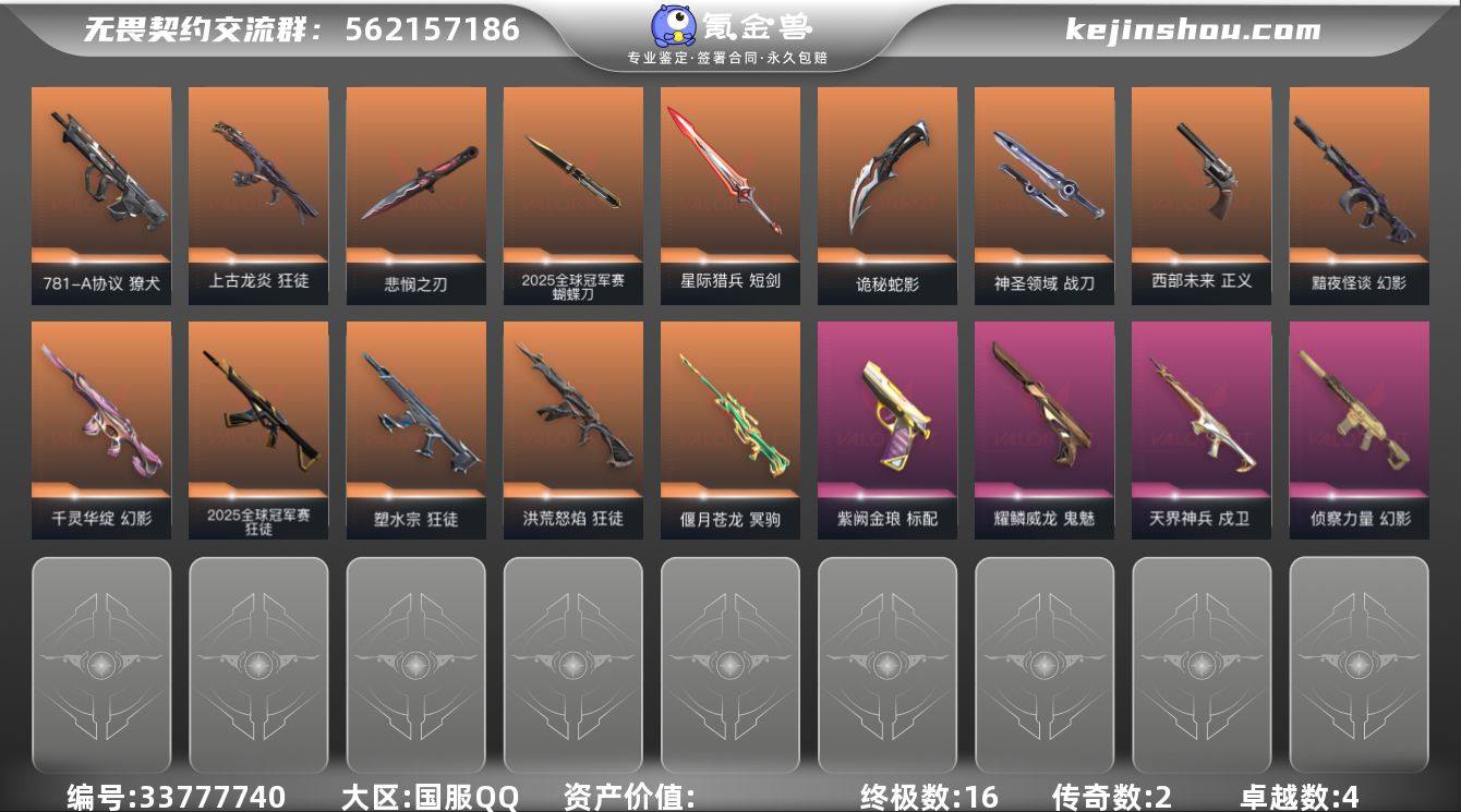 【套装】:2025全球冠军赛套装,无畏契约季前邀请赛套装 【英雄】:幻棱,炼狱,维斯,暮蝶,钛狐,壹决,铁臂,捷风,雷兹,幽影,不死鸟,贤者,猎枭,蝰蛇,芮娜,奇乐,尚勃勒,霓虹,斯凯,夜露,K/O,海神,盖可,黑梦,钢锁 【近战武器】:近战武器-2025全球冠军赛 蝴蝶刀,近战武器-蒙太奇 战斧,近战武器-碎心裂刃,近战武器-无畏契约季前邀请赛 悲悯之刃,近战武器-鬼丸国纲,近战武器-夜刃诡镰,近战武器-诡秘蛇影 军刀,近战武器-神圣领域 战刀,近战武器-星际猎兵 短剑 【狂徒】:狂徒-2025全球冠军赛,狂徒-洪荒怒焰,狂徒-塑水宗,狂徒-上古龙炎,狂徒-诡秘蛇影 【幻影】:幻影-黯夜怪谈,幻影-千灵华绽,幻影-侦察力量,幻影-神圣领域,幻影-蒙太奇,幻影-末日之翼 【戍卫】:戍卫-天界神兵,戍卫-月球哨兵,戍卫-折光棱晶 【獠犬】:獠犬-781-A协议,獠犬-神圣领域 【冥驹】:冥驹-偃月苍龙,冥驹-星云暗涌 【飞将】:飞将-末日之翼 【莽侠】:莽侠-诡秘蛇影,莽侠-月球哨兵 【战神】:战神-神圣领域,战神-蒙太奇 【奥丁】:奥丁-末日之翼 【判官】:判官-诡秘蛇影 【雄鹿】:雄鹿-月球哨兵 【骇灵】:骇灵-无限竞技,骇灵-蒙太奇,骇灵-星云暗涌 【蜂刺】...