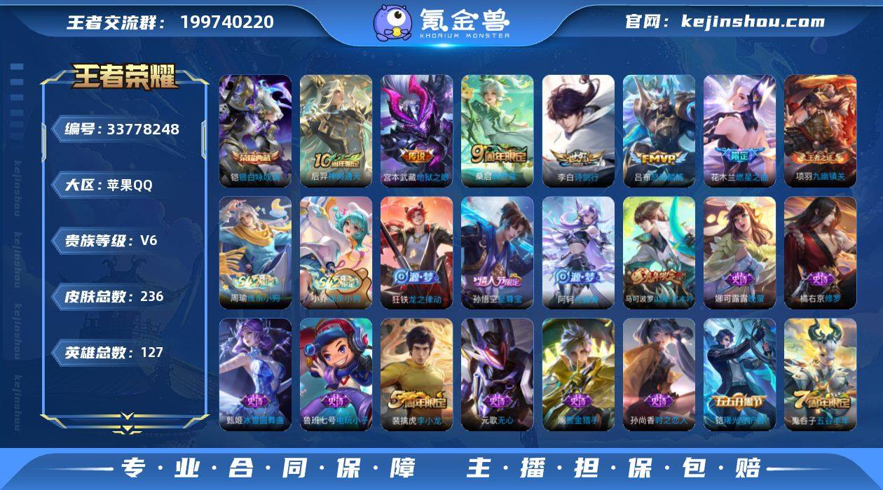 苹果Q-V6-至尊星耀IV段位-127英雄-236皮肤-1典藏皮肤-6传说-48史诗-对抗路31 发育路32 金标姜子牙 伽罗 赵云【英雄全皮】:影全皮【荣耀典藏】:铠银白咏叹调【传说皮肤】:后羿神树通天,桑启鸣野蒿,花木兰燃星之曲,吕布怒海麟威,李白诗剑行,宫本武藏地狱之眼【限定皮肤】:白起狰,大乔绒语心约,狄仁杰阴阳师,虞姬凯尔特女王,赵云皇家上将,赵云百木心枪,高渐离死亡摇滚,芈月重明,元歌无心,夏侯惇朔风刀,曹操烛龙,典韦穷奇,马可波罗山海玄木吟,狄仁杰魔术师,狄仁杰万华元夜,达摩沙漠行僧,项羽海滩派对,老夫子醍醐杖,程咬金演武夺筹,花木兰燃星之曲,孙悟空至尊宝,牛魔御旌,李元芳云中旅人,钟馗驱傩正仪,干将莫邪胡桃夹子,雅典娜黎明之约,太乙真人饕餮,鬼谷子原初探秘者,鬼谷子五谷丰年,苏烈千军破阵,百里玄策原初追逐者,弈星混沌棋,梦奇顽趣,沈梦溪大漠名商,明世隐疑决卦,裴擒虎李小龙,裴擒虎擒涛扼浪,狂铁御狮,米莱狄御霄,盾山御銮,鲁班大师探海日志,桑启海盐诗旅,艾琳女武神,张良古海寻踪,蒙恬荣光圣徽,鬼谷子天穹祈灯,刘邦剑破天穹,刘备异域游侠,周瑜熔金海岸【年限皮肤】:马可波罗山海玄木吟【赛季限定】:虞姬凯尔...
