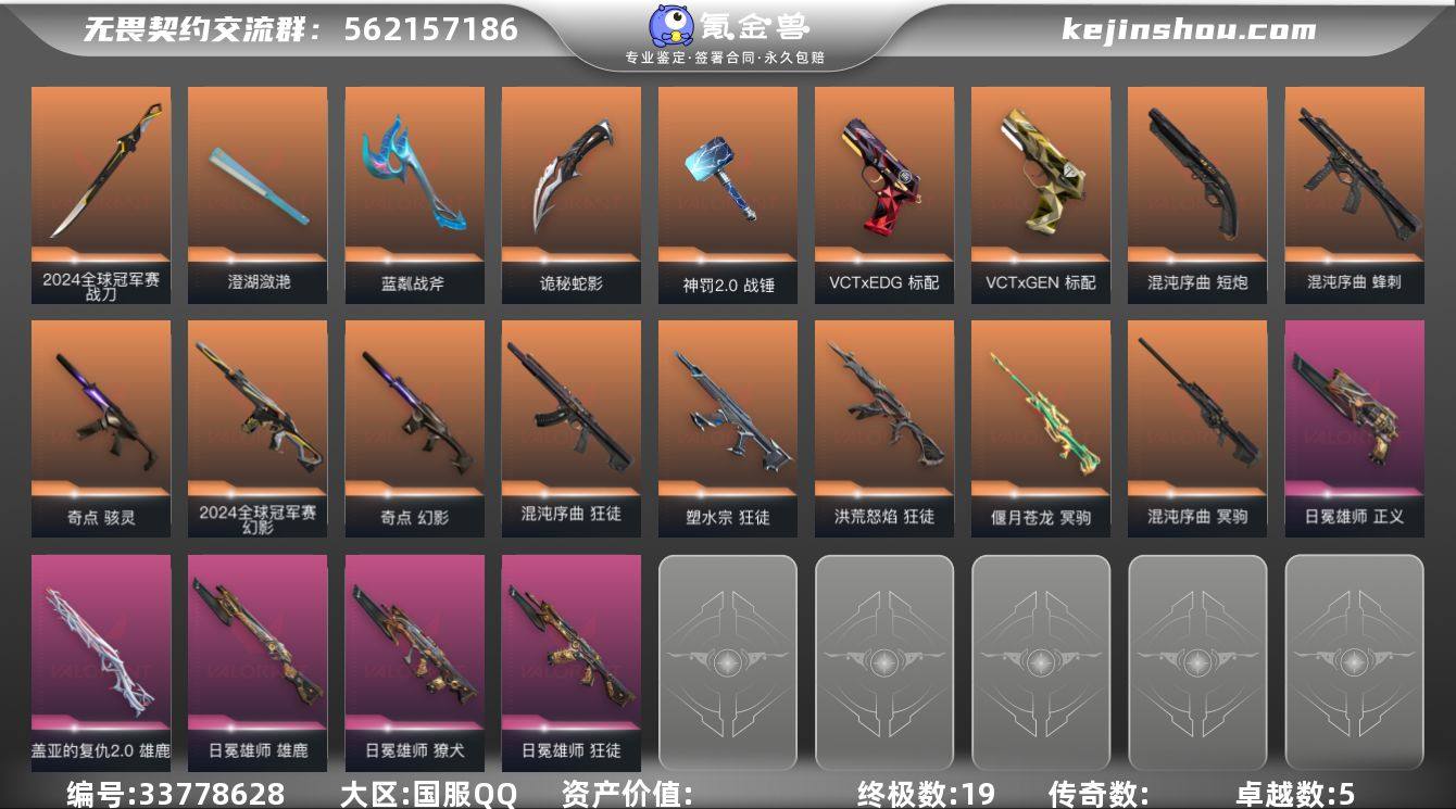 【套装】:2024全球冠军赛套装,混沌序曲套装,VCTxEDG 队伍套装,日冕雄师套装 【英雄】:幻棱,炼狱,维斯,暮蝶,壹决,捷风,幽影,不死鸟,贤者,猎枭,零,芮娜,尚勃勒,霓虹,夜露,盖可,钢锁 【近战武器】:近战武器-2024全球冠军赛 战刀,近战武器-澄湖潋滟,近战武器-埃芒迪尔大剑,近战武器-混沌大剑,近战武器-蓝粼战斧,近战武器-诡秘蛇影 军刀,近战武器-神罚//2.0 战锤 【狂徒】:狂徒-洪荒怒焰,狂徒-混沌序曲,狂徒-塑水宗,狂徒-日冕雄师,狂徒-超能偶像,狂徒-诡秘蛇影 【幻影】:幻影-2024全球冠军赛,幻影-奇点,幻影-末日之翼 【戍卫】:戍卫-超能偶像,戍卫-折光棱晶 【獠犬】:獠犬-日冕雄师,獠犬-采蜜小蜂队 【冥驹】:冥驹-混沌序曲,冥驹-偃月苍龙,冥驹-极简主义 【飞将】:飞将-聚合之力,飞将-末日之翼 【莽侠】:莽侠-诡秘蛇影 【战神】:战神-采蜜小蜂队,战神-浮光跃金 【奥丁】:奥丁-末日之翼 【判官】:判官-超能偶像,判官-诡秘蛇影,判官-采蜜小蜂队 【雄鹿】:雄鹿-盖亚的复仇//2.0,雄鹿-日冕雄师,雄鹿-模拟赫兹 【骇灵】:骇灵-奇点 【蜂刺】:蜂刺-混沌序曲,蜂刺-超限闪存,蜂刺-聚合之力,蜂刺-折光棱晶 【标配】:标配-浮光...