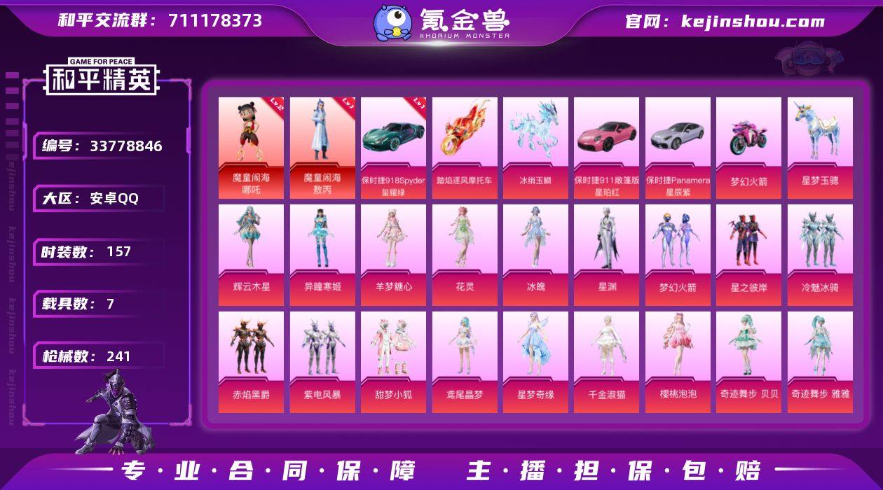 多女皮号!安卓手Q-2神装-22粉装-11特效枪-7载具-10粉色飞行器-91214热力值-6王牌印记-157套装-241枪皮 【红色载具】:保时捷918 Spyder(玺耀绿)(一级) 【红色神装等级】:魔童闹海-敖丙(一级),魔童闹海-哪吒(二级) 【红色角色神装】:魔童闹海-敖丙,魔童闹海-哪吒 【热门品类】:粉装-梦幻火箭,套装-龟仙人 【粉色套装】:粉装-梦幻火箭,粉装-星之彼岸,粉装-冷魅冰骑,粉装-赤焰黑爵,粉装-紫电风暴,粉装-甜梦小狐,角色-鸢尾晶梦,角色-星梦奇缘,角色-千金淑猫,角色-樱桃泡泡,角色-奇迹舞步 贝贝,角色-奇迹舞步 雅雅,角色-奇迹舞步 美琪,角色-奇迹舞步 美雪,角色-花灵,角色-冰魄,角色-星渊,角色-羊梦糖心,角色-异瞳寒姬,角色-辉云木星,角色-蜜语粉晶,角色-极地冰晶 【粉色枪皮等级】:SCAR-L-魔童闹海 哪吒(三级),AUG-星之彼岸(四级),M762-冷魅冰骑(五级),蜜獾-异瞳寒姬(四级),JS9-奇迹舞步(四级),P90-魔童闹海 敖丙(三级),Kar98K-巳巳如意(五级),Mk14-福马献瑞(五级),DP-28-豹影疾电(五级),MG-36-沧焰双生(五级),平底锅-喜羊羊与灰太狼(三级) 【粉色载具】:保时捷918 Spyder(玺耀绿),保时捷911 敞篷版(星珀红),保时捷Panamera(星...