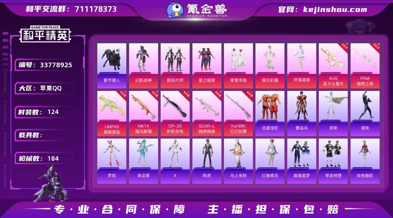 【kyhp1868】苹果 手Q-6粉装-7特效枪-0载具-1粉色飞行器-50954热力值-11王牌印记-124套装-184枪皮 【热门品类】:套装-都市猎人,套装-龟仙人,套装-粉红小猪 【粉色套装】:粉装-幻影战神,粉装-数码大师,粉装-星之彼岸,粉装-挚爱序曲,角色-烟云彩露,角色-荧海星豚 【粉色枪皮等级】:SCAR-L-锦绣绵绵(五级),AUG-圣斗士星矢(七级),UMP45-萌骑冒险(五级),Kar98K-巳巳如意(五级),Mk14-福马献瑞(五级),DP-28-豹影疾电(五级),PKM-江南烟雨(七级) 【粉色枪皮】:SCAR-L-锦绣绵绵,AUG-圣斗士星矢,UMP45-萌骑冒险,Kar98K-巳巳如意,Mk14-福马献瑞,DP-28-豹影疾电,PKM-江南烟雨 【粉色飞行器】:炫彩糖果飞行器 【粉色降落伞】:星之彼岸降落伞,梦之光华降落伞,梦幻舞会降落伞,江南烟雨降落伞,月影灵韵降落伞,雪月幻音降落伞,圣斗士星矢降落伞,无垠阁降落伞,异瞳寒姬降落伞,极意拳锋降落伞,炫彩糖果降落伞 【稀有套装】:套装-龟仙人,套装-巳巳如意,套装-炫彩糖果,角色-奈斯,角色-魂电,角色-罗莉,角色-幸运青,角色-X,角色-阿虎,套装-马上来财,套装-迅捷龙虾,套装-燕燕于飞,套装-鱼渊荷华,角色-风玲,套装-星渊小夜曲,套装-彩虹兔,套装-云朵...