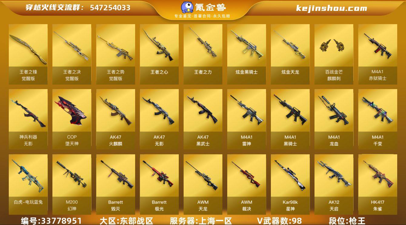 上海一区-111V-6王者武器数-3炫金武器数 【热门武器】:QBZ03-金色蔷薇*2,Scar Light-白虎,HK417-朱雀,M200-幻神,M200-竞技荣光,死亡之眼,白虎-电玩蓝兔,Kar98K-星神,M4A1-黑骑士,汤姆逊-烈龙*6,RPK-盘龙*5,加特林-炼狱,斯泰尔-蝴蝶,火麒麟-绝迹,USP-雷暴,COP-堕天神,沙鹰-修罗*4 【王者炫金武器】:王者之心,王者之力,炫金骑士*2,炫金天龙 【音效卡】:屠龙-电竞之星-竞星跃动音效卡,M200-幻神音效卡,AK47-火麒麟音效卡,M4A1-雷神音效卡,M4A1-黑骑士音效卡,Barrett-毁灭音效卡,Barrett-碧霄极光音效卡,炼狱-百战金芒-庆典舞曲音效卡 【皮肤】:幻神-AG-CFPLS17冠军,白虎-电玩粉兔皮肤,雷神-荣耀之魄,雷神-虎将,雷神-耀金皮肤,M4A1-再燃火线,火麒麟-华夏之心,火麒麟-轻羽皮肤,毁灭耀金皮肤,毁灭-星空*3,毁灭-AG-CFPLS15冠军,黑龙-能量核心,M4A1-黑龙-361,黑骑士-暗月,黑骑士-电玩青兔皮肤,AK47-黑武士-361,战神-紫绶金章皮肤,战神-流金岁月皮肤,AK47-B-常胜将军-曹操,AK47-B-常胜将军-孙权*2,AWM-天龙-传奇70KG,AWM-天龙-传奇白鲨,修罗-星空,轻型军用手斧-再燃火线 【角色】:魅影,电竞教官-云悠悠,零·纪元,战地猎狐,王...