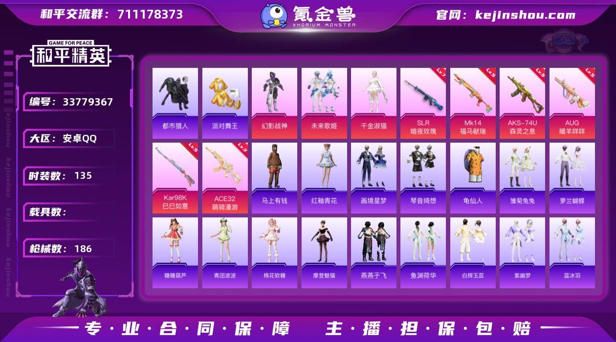 【961213】安卓【素材号 套装-都市猎人/套装-派对舞王/角色-千金淑猫/AUG-暖羊咩咩(五级)/ACE32-萌骑漫游(三级)】手Q-3粉装-6特效枪-0载具-1粉色飞行器-51955热力值-11王牌印记-135套装-186枪皮 【热门品类】:套装-都市猎人,套装-派对舞王,套装-龟仙人 【粉色套装】:粉装-幻影战神,粉装-未来歌姬,角色-千金淑猫 【粉色枪皮等级】:AUG-暖羊咩咩(五级),ACE32-萌骑漫游(三级),AKS-74U-森灵之息(五级),Kar98K-巳巳如意(五级),Mk14-福马献瑞(五级),SLR-暗夜玫瑰(七级) 【粉色枪皮】:AUG-暖羊咩咩,ACE32-萌骑漫游,AKS-74U-森灵之息,Kar98K-巳巳如意,Mk14-福马献瑞,SLR-暗夜玫瑰 【粉色飞行器】:花傲天飞行器 【粉色降落伞】:洛神天依降落伞,炎氏战神降落伞,繁龙极客降落伞,金丰海韵降落伞,临安公主降落伞,异瞳寒姬降落伞 【稀有套装】:套装-龟仙人,套装-马上有钱,套装-雏菊兔兔,套装-萝兰蝴蝶,套装-糖糖葫芦,套装-青团波波,套装-棉花软糖,角色-摩登魅猫,套装-燕燕于飞,套装-鱼渊荷华,套装-白辉玉蕊,套装-紫幽梦,套装-蓝冰羽,套装-雪绒豹,套装-画境星梦,套装-琴音绮想,套装-雨过天青,套装-红釉青花 【稀有枪皮】:AUG-冰晶雪宝,AKM-影袭...