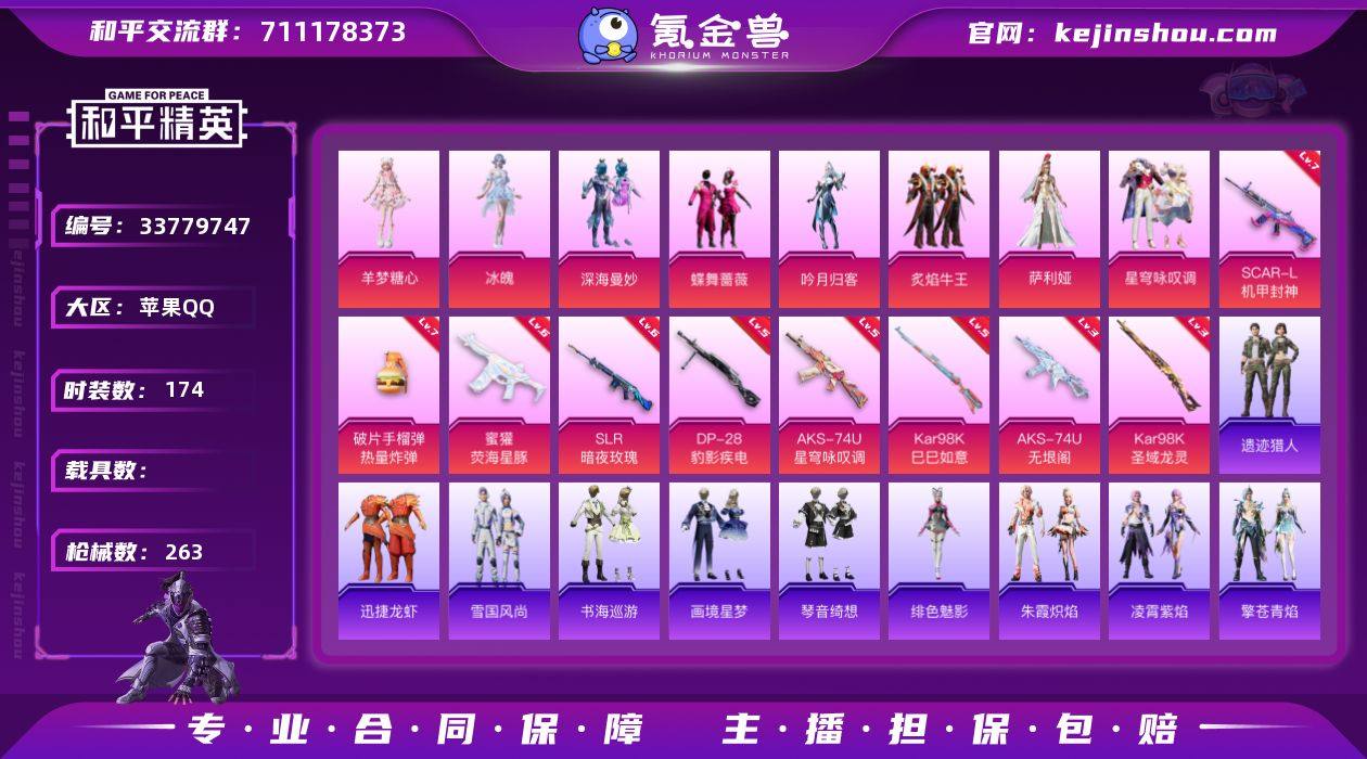苹果【素材号 套装-暗影哥特/角色-羊梦糖心/套装-浪漫天命/SCAR-L-机甲封神(七级)/蜜獾-荧海星豚(六级)/百万伏特背包】手Q-8粉装-9特效枪-0载具-7粉色飞行器-81189热力值-15王牌印记-174套装-263枪皮 【热门品类】:套装-浪漫天命,角色-军刀雅典娜,套装-金羽特工,套装-忍者信条,套装-龟仙人,套装-暗影哥特 【粉色套装】:粉装-深海曼妙,粉装-蝶舞蔷薇,粉装-吟月归客,粉装-炙焰牛王,角色-萨利娅,粉装-星穹咏叹调,角色-冰魄,角色-羊梦糖心 【粉色枪皮等级】:SCAR-L-机甲封神(七级),蜜獾-荧海星豚(六级),AKS-74U-星穹咏叹调(五级),AKS-74U-无垠阁(三级),Kar98K-巳巳如意(五级),Kar98K-圣域龙灵(三级),SLR-暗夜玫瑰(六级),DP-28-豹影疾电(五级),破片手榴弹-热量炸弹(七级) 【粉色枪皮】:SCAR-L-机甲封神,蜜獾-荧海星豚,AKS-74U-星穹咏叹调,AKS-74U-无垠阁,Kar98K-巳巳如意,Kar98K-圣域龙灵,SLR-暗夜玫瑰,DP-28-豹影疾电,破片手榴弹-热量炸弹 【粉色飞行器】:炫彩糖果飞行器,沙丘之主天马,镜域双华-灵镜之阶,龙翔九天飞行器,终晖之翼飞行器,飞天猪飞行器,暮色之舞飞行器 【粉色降落伞】:绝对恒星降落伞,幻影战神降落伞,星之信仰降落伞,王...