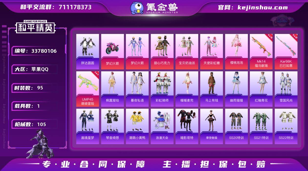 【961227】苹果 【素材号 粉装-梦幻火箭/套装-浪漫天命/甜心三姐妹/套装-暗影哥特/双人摩托-梦幻火箭】手Q-5粉装-3特效枪-1载具-0粉色飞行器-29567热力值-5王牌印记-95套装-105枪皮 【热门品类】:粉装-梦幻火箭,套装-浪漫天命,套装-胖达圆圆,套装-潮萌小黄鸭,套装-暗影哥特 【粉色套装】:粉装-甜心巧克力,粉装-宝贝奶油派,粉装-天使彩虹糖,粉装-梦幻火箭,角色-樱桃泡泡 【粉色枪皮等级】:UMP45-萌骑冒险(一级),Kar98K-巳巳如意(二级),Mk14-福马献瑞(五级) 【粉色载具】:双人摩托-梦幻火箭 【粉色枪皮】:UMP45-萌骑冒险,Kar98K-巳巳如意,Mk14-福马献瑞 【粉色降落伞】:甜心宝贝降落伞,樱桃泡泡降落伞,炫彩糖果降落伞 【稀有套装】:套装-雪国风尚,套装-暖暖麦兜,套装-彩虹骑师,套装-马上有钱,套装-暮夜私语,角色-摩登魅猫,套装-画境星梦,套装-琴音绮想,套装-雨过天青,套装-红釉青花,角色-幽雨猫猫,角色-枫露凝珀 【稀有枪皮】:AKM-破晓战魂,M16A4-幻世战舞者,M16A4-甜心亚梦,M16A4-红色方程式,SCAR-L-夜灯,SCAR-L-玉兔迎春,SCAR-L-红色方程式,M416-糯团青竹,M416-红色方程式,M416-蓝色火焰,GROZA-影袭,GROZA-田园牧歌,AUG-耀粉歌...