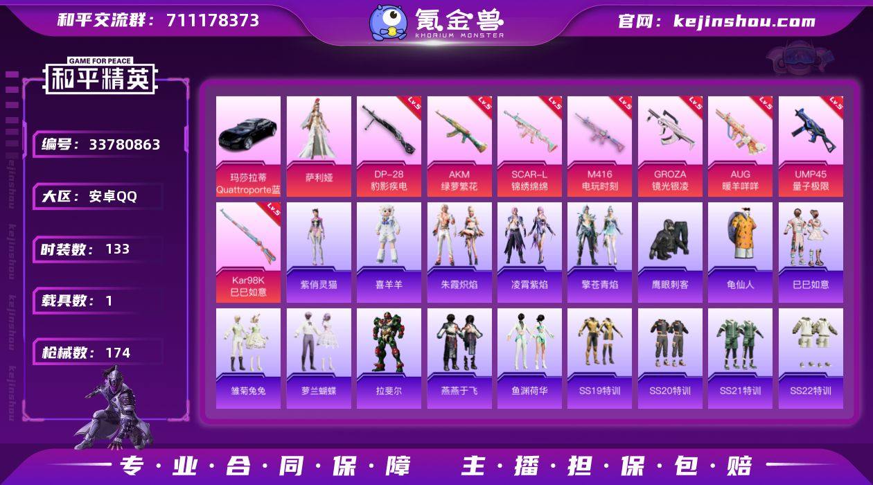 【kyhp1894】安卓 手Q-1粉装-8特效枪-1载具-2粉色飞行器-48698热力值-14王牌印记-133套装-174枪皮 【热门品类】:套装-龟仙人 【粉色套装】:角色-萨利娅 【粉色枪皮等级】:AKM-绿萝繁花(五级),SCAR-L-锦绣绵绵(五级),M416-电玩时刻(五级),GROZA-镜光银凌(五级),AUG-暖羊咩咩(五级),UMP45-量子极限(五级),Kar98K-巳巳如意(五级),DP-28-豹影疾电(五级) 【粉色载具】:玛莎拉蒂Quattroporte(夜幕蓝) 【粉色枪皮】:AKM-绿萝繁花,SCAR-L-锦绣绵绵,M416-电玩时刻,GROZA-镜光银凌,AUG-暖羊咩咩,UMP45-量子极限,Kar98K-巳巳如意,DP-28-豹影疾电 【粉色飞行器】:炫彩糖果飞行器,星际浪客飞行器 【粉色降落伞】:环太平洋降落伞,旋转彩虹降落伞,繁龙极客降落伞,创世·救赎降落伞,无垠阁降落伞,喜羊羊与灰太狼降落伞,炫彩糖果降落伞 【稀有套装】:套装-龟仙人,套装-巳巳如意,套装-炫彩糖果,套装-雏菊兔兔,套装-萝兰蝴蝶,角色-拉斐尔,套装-燕燕于飞,套装-鱼渊荷华,套装-朱霞炽焰,套装-凌霄紫焰,套装-擎苍青焰,玩偶服-喜羊羊,角色-紫俏灵猫 【稀有枪皮】:AUG-冰晶雪宝,AKM-破晓战魂,AKM-缤纷海域,AKM-霓虹街区,AKM-龙的传人,M16A4-幻世战舞者...
