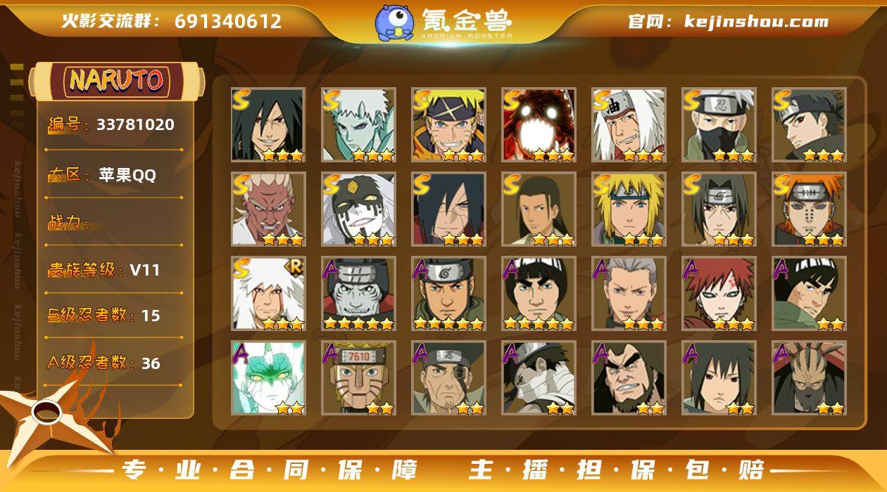 【苹果Q编号42617 可秒换绑】【店长推荐!极品手法号!暴怒六尾+创立柱间+十尾带土+神驹斑!! !】15S级忍者数-36A级忍者数 【S级忍者】:宇智波斑「秽土转生·解」(3星),艾「忍界大战」(3星),宇智波鼬「须佐能乎」(3星),宇智波止水「须佐能乎」(3星),旗木卡卡西「须佐能乎」(3星),千手柱间「木叶创立」(3星),自来也「舞之豪杰」(3星),自来也「传说中的三忍」(3星),波风水门(3星),佩恩「天道」(3星),大筒木桃式(3星),漩涡鸣人「暴怒·第六尾」(3星),漩涡鸣人·宇智波佐助(3星),宇智波带土「十尾人柱力」(3星),宇智波斑「神驹佑将」(3星) 【A级忍者】:艾「青年」(2星),波风水门「青年」(2星),迪达拉(2星),迪达拉「秽土转生」(2星),迪达拉「晓创生」(2星),飞段(3星),飞段「死司凭血」(2星),干柿鬼鲛(5星),漩涡博人「桃式显现」(2星),漩涡鸣人「九尾查克拉」(2星),机械鸣人「初始形态」(2星),迈特凯(5星),旗木卡卡西「神威对决」(2星),桃地再不斩「秽土转生」(2星),我爱罗「疾风传」(3星),蝎(2星),蝎「绯流琥」(2星),小南「神驹佑将」(2星),角都「秽土转生」(2星),猿飞阿斯玛(5星),宇智波鼬(2星),宇智波鼬「夏日限定」(2星),宇智波佐助「须佐...