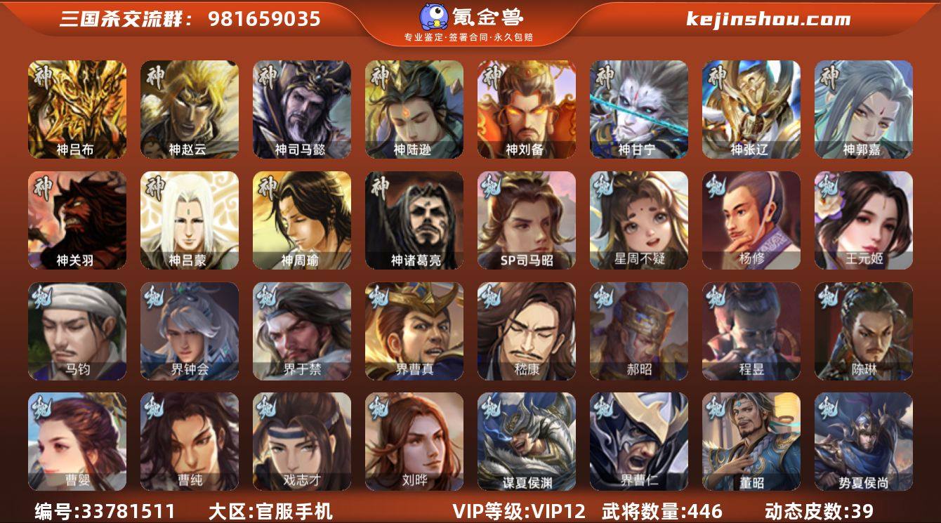 官阶:大将军;VIP等级:VIP12;史诗武将数量:74;动态皮肤数量:39;武将总数:446;史诗宝珠数量:0;将魂数量:1156;神将:9;魏国史诗武将:33;蜀国史诗武将:13;吴国史诗武将:9;群史诗武将:29