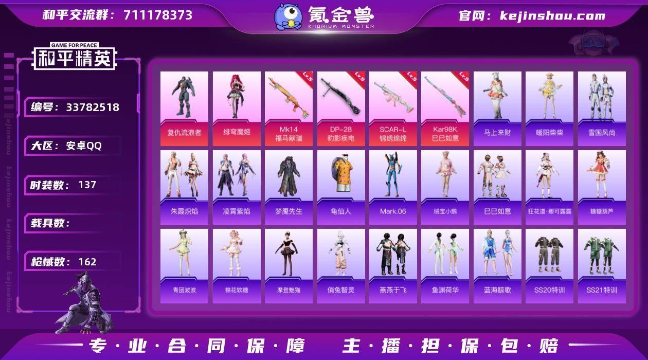 无二次 安卓手Q-无敌战神框-2粉装-4特效枪-1粉色飞行器-49305热力值-13王牌印记-137套装-162枪皮 LK264226 【热门品类】:套装-龟仙人,角色-Mark.06 【粉色套装】:角色-复仇流浪者,角色-绯穹魔姬 【粉色枪皮等级】:SCAR-L-锦绣绵绵(五级),Kar98K-巳巳如意(五级),Mk14-福马献瑞(五级),DP-28-豹影疾电(五级) 【粉色枪皮】:SCAR-L-锦绣绵绵,Kar98K-巳巳如意,Mk14-福马献瑞,DP-28-豹影疾电 【粉色飞行器】:炫彩糖果飞行器 【粉色降落伞】:绝对恒星降落伞,洛神天依降落伞,蜜语绒猫降落伞,初号机 觉醒Ver.降落伞,千金淑猫降落伞,月影灵韵降落伞,智耀战神降落伞,炫彩糖果降落伞 【稀有套装】:套装-龟仙人,套装-绒宝小鹅,套装-巳巳如意,套装-雪国风尚,套装-炫彩糖果,套装-马上来财,角色-狂花道·娜可露露,套装-糖糖葫芦,套装-青团波波,套装-棉花软糖,角色-摩登魅猫,角色-俏兔智灵,套装-燕燕于飞,套装-鱼渊荷华,套装-蓝海鲸歌,套装-朱霞炽焰,套装-凌霄紫焰,角色-暖阳柴柴 【稀有枪皮】:AKM-彩虹符号,AKM-生命誓言,AKM-破晓战魂,AKM-胡桃卫兵,AKM-虎虎生威,AKM-霓虹街区,M16A4-千金淑猫,SCAR-L-玉兔迎春,SCAR-L-红色方程式,M416-糯团青...