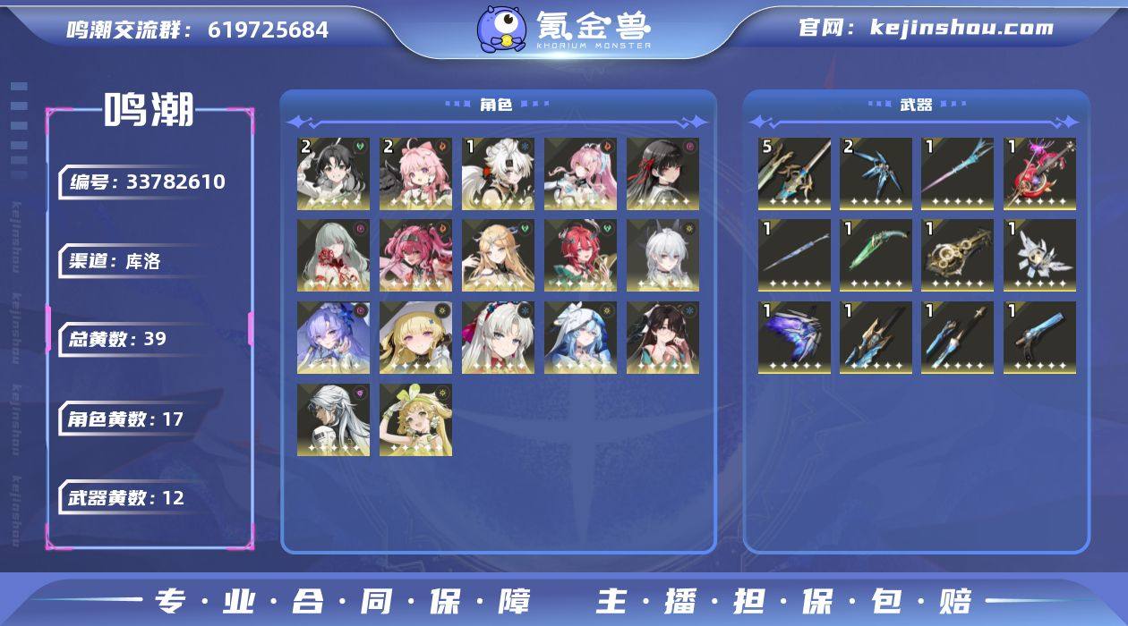 男/女主: 男主 总黄数: 39 联觉等级: 80 拥有五星共鸣者: 鉴心,卡卡罗,安可,维里奈,凌阳,折枝,守岸人,珂莱塔,菲比,坎特蕾拉,赞妮,夏空,卡提希娅,露帕,弗洛洛,千咲,爱弥斯 2鸣五星共鸣者: 2鸣鉴心,2鸣安可 1鸣五星共鸣者: 1鸣凌阳 0鸣五星共鸣者: 0鸣卡卡罗,0鸣维里奈,0鸣折枝,0鸣守岸人,0鸣珂莱塔,0鸣菲比,0鸣坎特蕾拉,0鸣赞妮,0鸣夏空,0鸣卡提希娅,0鸣露帕,0鸣弗洛洛,0鸣千咲,0鸣爱弥斯 拥有五星武器: 浩境粼光,千古洑流,停驻之烟,漪澜浮录,星序协响,和光回唱,血誓盟约,焰光裁定,林间的咏叹调,不屈命定之冠,幽冥的忘忧章,永远的启明星 5鸣五星武器: 5鸣血誓盟约 2鸣五星武器: 2鸣漪澜浮录 1鸣五星武器: 1鸣浩境粼光,1鸣千古洑流,1鸣停驻之烟,1鸣星序协响,1鸣和光回唱,1鸣焰光裁定,1鸣林间的咏叹调,1鸣不屈命定之冠,1鸣幽冥的忘忧章,1鸣永远的启明星 亮点: 【MC384】80级/39黄/男主/17个五星角色/12个五星武器未绑定,爱弥斯,赞妮,夏空,卡提希娅,露帕,弗洛洛,千咲,菲比,坎特蕾拉,珂莱塔,守岸人,折枝,维里奈,卡卡罗,鉴心,安可,凌阳,永远的启明星,幽冥的忘忧章,不屈命定之冠,焰光裁定,林间的咏叹调,血誓盟约,和光回唱,星序协响,浩境粼光,千古洑流,停驻之烟,漪澜浮录,2命鉴心,2命...