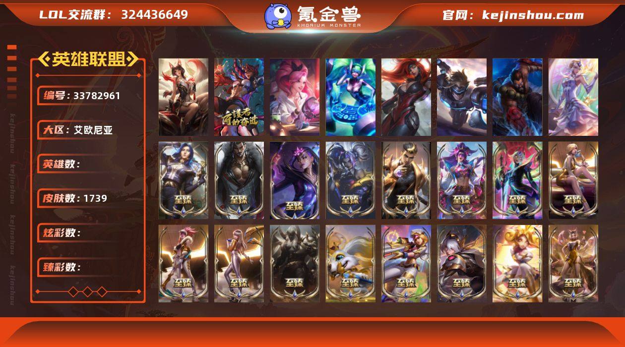 三色龙虾!暗星绝杀烬!黎明卡尔玛!斩星魔剑!可二次!E12507.艾欧尼亚-1739皮1卓越(一档阿狸)145神话361限定107臻彩4神话小小英雄(月夜幻龙小小亚索!大聪明胖胖龙!源计划菜大师!神龙烈焰小小金克丝!)+3神话棋盘(虎啸龙吟!卧龙之境!究极霸天零式!)