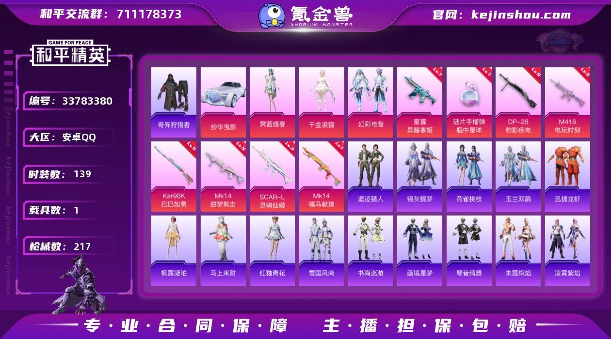 【961298】安卓【小号 角色-千金淑猫/套装-暗影哥特/SCAR-L-灵驹仙姬(三级)/M416-电玩时刻(五级)/纱华曳影】手Q-3粉装-8特效枪-1载具-4粉色飞行器-60649热力值-13王牌印记-139套装-217枪皮 【热门品类】:套装-浪漫天命,套装-奇异狩猎者,套装-龟仙人,套装-暗影哥特,套装-粉红小猪 【粉色套装】:角色-千金淑猫,粉装-幻彩电音,角色-霁蓝缠春 【粉色枪皮等级】:SCAR-L-灵驹仙姬(三级),M416-电玩时刻(五级),蜜獾-异瞳寒姬(七级),Kar98K-巳巳如意(五级),Mk14-甜梦熊击(五级),Mk14-福马献瑞(一级),DP-28-豹影疾电(五级),破片手榴弹-瓶中星球(七级) 【粉色载具】:纱华曳影 【粉色枪皮】:SCAR-L-灵驹仙姬,M416-电玩时刻,蜜獾-异瞳寒姬,Kar98K-巳巳如意,Mk14-甜梦熊击,Mk14-福马献瑞,DP-28-豹影疾电,破片手榴弹-瓶中星球 【粉色飞行器】:炫彩糖果飞行器,圣域金龙飞行器,云梦轻舟飞行器,冰狼掠影飞行器 【粉色降落伞】:闲梦青缨降落伞,千金淑猫降落伞,圣域龙灵降落伞,幻彩电音降落伞,荧海星豚降落伞,喜羊羊与灰太狼降落伞,魔童闹海 敖丙降落伞,异瞳寒姬降落伞,炫彩糖果降落伞,灵驹仙姬降落伞,鸢尾珑雾降落伞 【稀有套装】:套装-龟仙人,套装-绒...