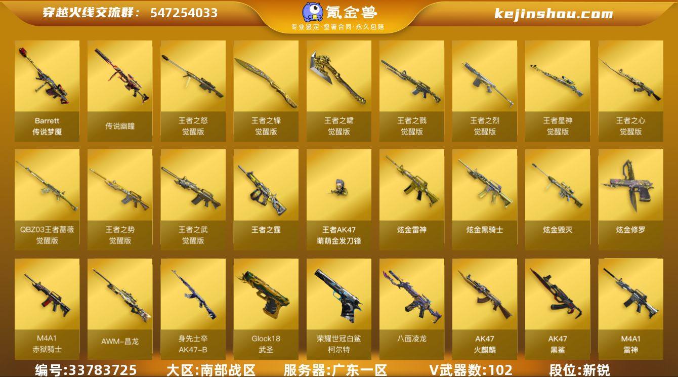 【ky7128】广东一区-117V-13王者武器数-4炫金武器数 【传说武器】:传说梦魇,传说幽瞳 【热门武器】:传说梦魇,传说幽瞳,G36C-幻影,QBZ03-金色蔷薇,Scar Light-白虎,M200-幻神,柯尔特-荣耀世冠白鲨2023,八面凌龙,死亡之眼,QBZ03-街机,炼狱-迷你小钢,毒蜂,M4A1-黑骑士*5,汤姆逊-烈龙*6,RPK-盘龙*6,加特林-炼狱*3,斯泰尔-蝴蝶,王者AK47-萌萌银发刀锋,毁灭-孙三炮,沙鹰-修罗*7,炽芒蝶刃-荣耀世冠白鲨2023 皮肤 【王者炫金武器】:王者之霆,炫金骑士,炫金雷神,炫金毁灭,炫金修罗 【音效卡】:M4A1-雷神音效卡,M4A1-黑骑士音效卡,Barrett-毁灭音效卡,AWM-裁决音效卡,Barrett-碧霄极光音效卡,AWM-昌龙-怀旧音效卡*2 【皮肤】:M200-幻神-黄忠皮肤,幻神-AG-CFPLS17冠军,M200-幻神-荣耀世冠白鲨,幻神-荣耀世冠白鲨2023 皮肤,雷神-荣耀之魄,M4A1-雷神-CFS 2019,雷神-耀金皮肤*2,雷神-传奇N9,雷神-荣耀世冠AG,雷神-源计划2.0专属 皮肤,炼狱-末日审判 皮肤,AK47-火麒麟-传奇EVEN,火麒麟-轻羽皮肤,毁灭耀金皮肤,毁灭-战神张飞,毁灭-BEAN-2020MVP,毁灭-魔灵皮肤,黑龙-暗月,黑骑士-暗月,战神-紫绶金章皮肤,战神-流金岁月皮肤,AK47-B-常...