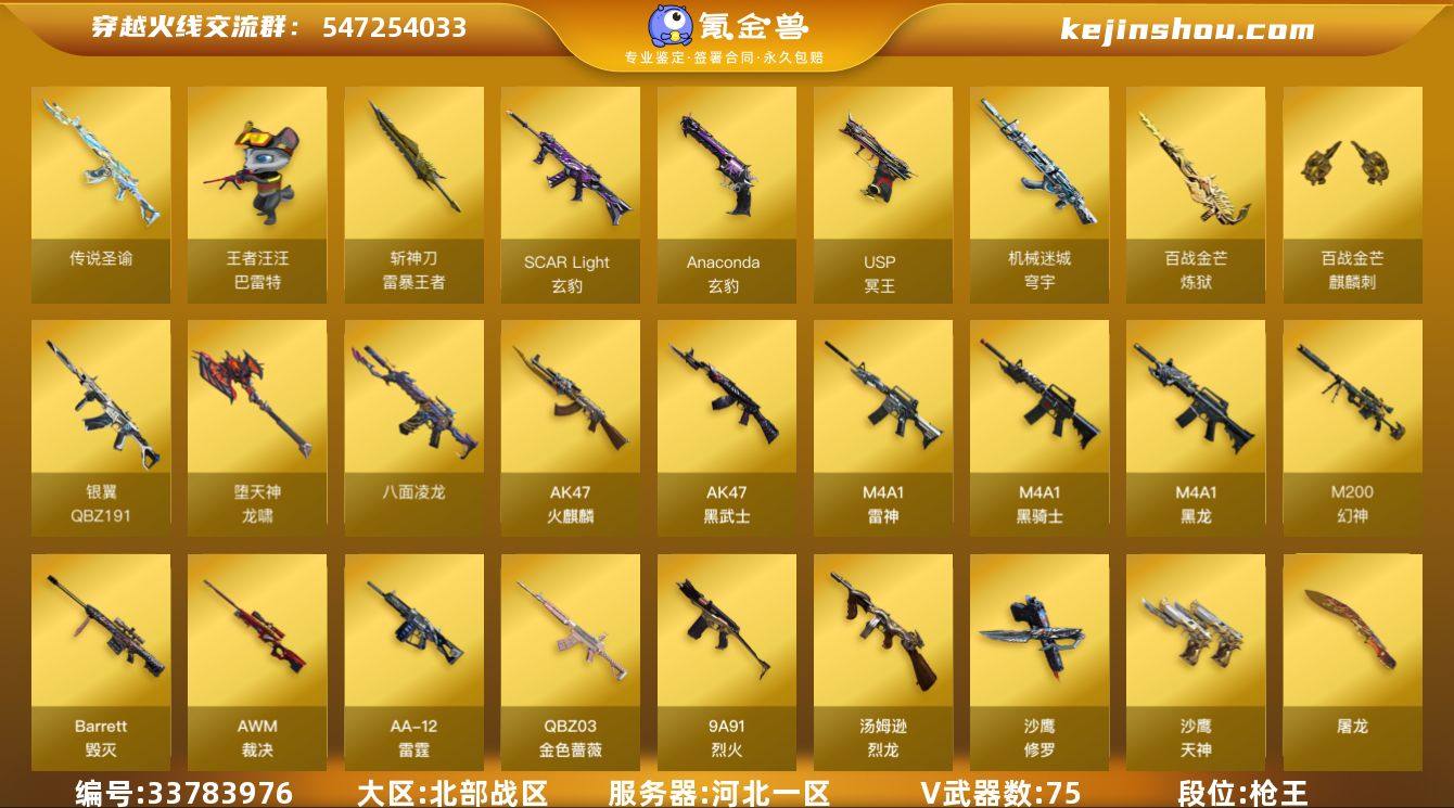 【C6767】河北一区-81V-9王者武器数-0炫金武器数 【传说武器】:传说圣谕 【热门武器】:传说圣谕,G36C-幻影,QBZ03-金色蔷薇,M14EBR-玄武,M200-幻神,八面凌龙,荣耀世冠-雷神,M4A1-黑骑士,汤姆逊-烈龙*6,斯泰尔-蝴蝶,沙鹰-修罗*2,荣耀世冠-龙啸 【王者炫金武器】:王者玄武,斩神刀-雷暴王者,王者冰锋 【音效卡】:M14EBR-玄武音效卡,屠龙-电竞之星-竞星跃动音效卡,M4A1-黑骑士音效卡,AWM-裁决音效卡,HK417-朱雀-电竞之星-竞星跃动音效卡,M4A1-苍鸣雷神音效卡,Barrett-碧霄极光音效卡,白虎-盛典舞曲音效卡,炼狱-百战金芒-庆典舞曲音效卡,柯尔特-百战金芒-庆典舞曲音效卡 【皮肤】:幻神-丹凤,Kar98K-星神-冠军之星皮肤,裁决-运输船 皮肤,白虎-霓虹机甲 皮肤,QBZ03-荣耀世冠EP 皮肤,幻影-量子聚变 皮肤,雷神-高能霹雳 皮肤,M4A1-雷神-拼搏,M4A1-再燃火线,雷神-神秘按键 皮肤,毁灭-暗月,黑龙-冠军之武,黑骑士-暗月,黑骑士-AG-S4冠军典藏,黑武士-典韦皮肤,玄武-幻灵装甲 皮肤,修罗-冠军之魂,修罗-百战金芒 皮肤,屠龙-星火燎原,屠龙-春桃 皮肤,龙啸-黯钢战甲 皮肤,轻型军用手斧-再燃火线 【角色】:葵,关小雨,研,荆棘,零·纪元,乔伊...