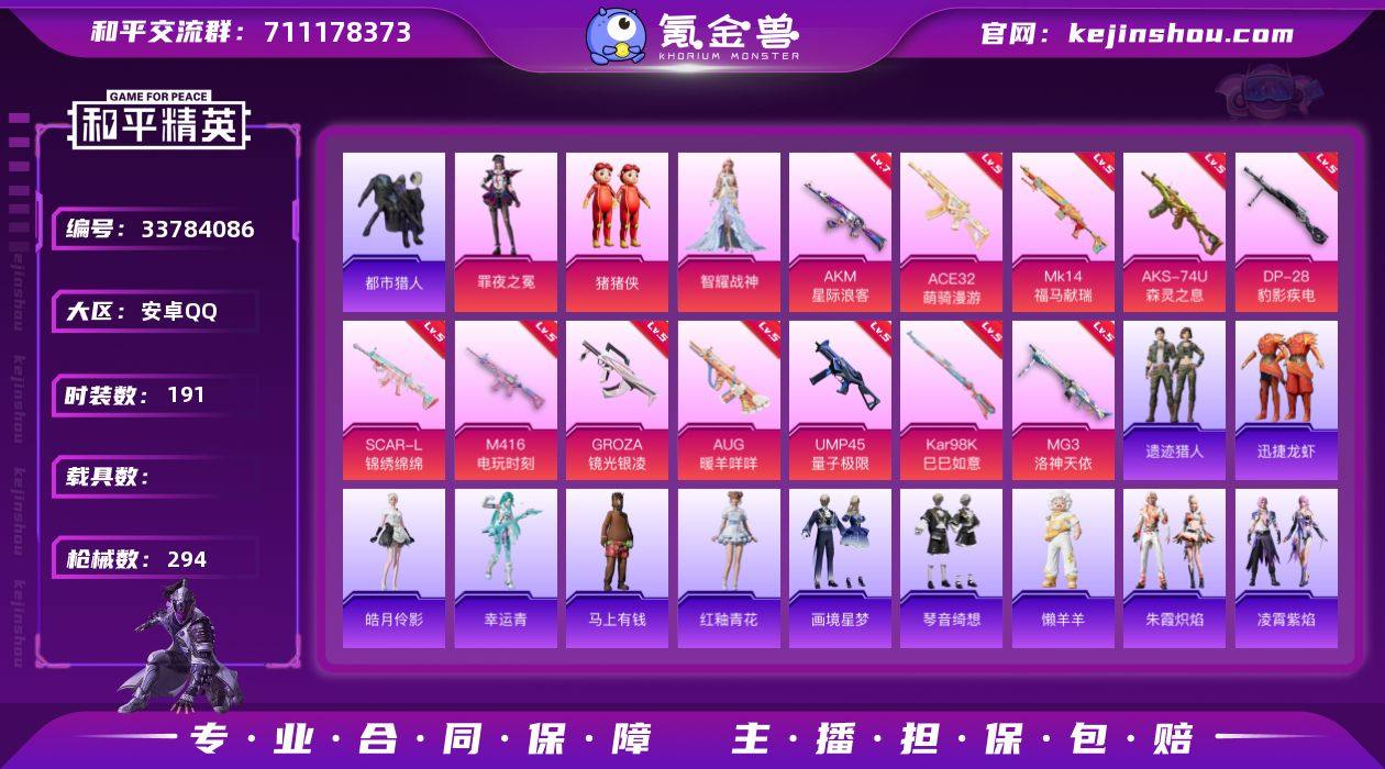 【kyhp1948】安卓 手Q-3粉装-12特效枪-0载具-3粉色飞行器-82222热力值-15王牌印记-191套装-294枪皮 【热门品类】:套装-都市猎人,套装-忍者信条,套装-暗夜之虎 【粉色套装】:玩偶服-猪猪侠,角色-智耀战神,角色-罪夜之冕 【粉色枪皮等级】:AKM-星际浪客(七级),SCAR-L-锦绣绵绵(五级),M416-电玩时刻(五级),GROZA-镜光银凌(五级),AUG-暖羊咩咩(五级),ACE32-萌骑漫游(五级),UMP45-量子极限(五级),AKS-74U-森灵之息(五级),Kar98K-巳巳如意(五级),Mk14-福马献瑞(五级),DP-28-豹影疾电(五级),MG3-洛神天依(五级) 【粉色枪皮】:AKM-星际浪客,SCAR-L-锦绣绵绵,M416-电玩时刻,GROZA-镜光银凌,AUG-暖羊咩咩,ACE32-萌骑漫游,UMP45-量子极限,AKS-74U-森灵之息,Kar98K-巳巳如意,Mk14-福马献瑞,DP-28-豹影疾电,MG3-洛神天依 【粉色飞行器】:炫彩糖果飞行器,齐天大圣飞行器,极意拳锋飞行器 【粉色降落伞】:百万伏特降落伞,暗夜玫瑰降落伞,洛神天依降落伞,恐龙拽拽降落伞,环太平洋降落伞,彩虹甜喵降落伞,暗夜鎏金降落伞,创世·救赎降落伞,临安公主降落伞,智耀战神降落伞,星穹咏叹调降落伞,无垠阁降落伞,魔童闹海 敖丙降落伞,炫彩糖果降落伞,鸢尾...