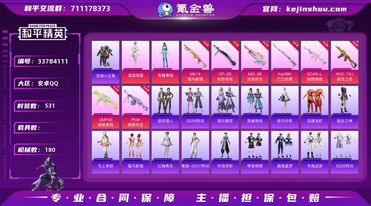 实名: 不可修改 时装数: 531 枪械数: 180 战备数: 127 热门装扮: 深海小丑鱼,迅捷狂鲨,鹰眼刺客,异瞳寒姬,鸢尾珑雾 稀有枪皮: SCAR-L-锦绣绵绵,Kar98K-巳巳如意,DP-28-豹影疾电,MG-36-沧焰双生,AKS-74U-森灵之息,PKM-萌骑夺宝,UMP45-萌骑冒险