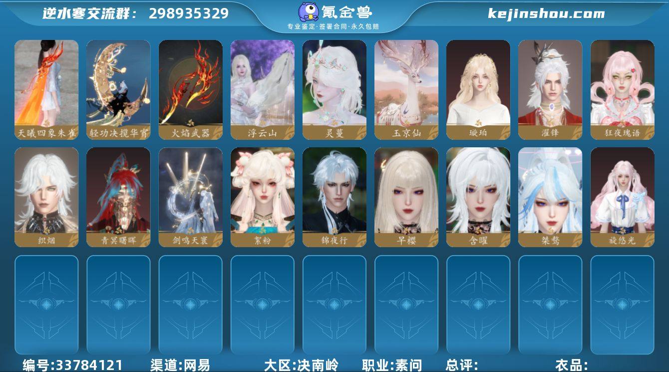 【已用天赏石22-转盘外观1-未用1】战力值:2102656 总评:2102656 角色等级:89 衣品值: 289945 国色值: 71880 已用天赏石:22 天霓染数量:1 【网易手机账号】 【无换绑冷却】 【素问】 【女】 【6级】 【把酒临风】 【互通】 转盘外观1 副本外观3 天赏外观17 天赏祥瑞1 武器环身2 转盘外观:旋悠光; 副本外观:白夜拂雪,椒飨,霜途无间; 天赏外观:织烟,星芒冠,青冥曙晖,璇珀,桀骜,含曜,早樱,濯锋,灵蔓,絮粉,浮云山,锦夜行,狂夜瑰语,火焰武器,轻功诀揽华宵,绝技天曦四象·朱雀,绝技剑鸣天寰; 天赏祥瑞:玉京仙; 武器环身:谪仙雷剑,剑渡东海;