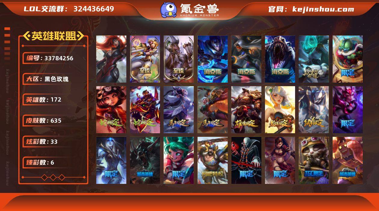t40372【黑色玫瑰】原皮龙瞎 635皮肤 33炫彩 6臻彩 7神话/112限定/47传说/172英雄 账号等级:215 单双排段位:白银 【重要头像】觅心之翼奎因 灵魂莲华莉莉娅 真实伤害阿卡丽炫彩 冠军之箭艾希凯旋盛装 【重要皮肤】电玩女神凯特琳至臻 魅惑女巫厄运小姐至臻 海克斯科技雷克顿 海克斯科技嘉文四世 新创战纪希维尔 胜利女神娑娜 胜利女神希维尔 创星之灵璐璐 钢铁军团拉克丝 暗黑灵魂阿利斯塔 巨角幻兽阿利斯塔 安妮梦游仙境 电玩女神厄运小姐 玉剑传说舞龙卫 龙的传人李青 银龙裁决泰隆 替父从军花木兰 古琴余韵娑娜 春晖神女拉克丝 你看见过我的熊猫吗安妮 广寒仙子嫦娥 张辽文远 神龙之翼库奇 胜利机器人布里茨 胜利枪神格雷福斯 胜利女神莫甘娜 觅心之翼奎因 幽梦玫瑰辛德拉 北极星圣贤基兰 圣诞老人德莱文 持胡萝卜的雪人易 冰雪女神辛德拉 魄罗骑士瑟庄妮 平安夜女神娑娜 圣诞糖果棒厄运小姐 魅惑女巫莫甘娜 魅惑女巫奈德丽 灵魂收割者索拉卡 海之歌奈德丽 泳池派对辛德拉 泳池派对厄运小姐 泳池派对格雷福斯 泳池派对蕾欧娜 电玩战魂赫卡里姆 御星魔矢艾希 创战纪希维尔 克格汪 iG卡蜜尔 iG洛 iG卡莎 iG艾瑞莉...