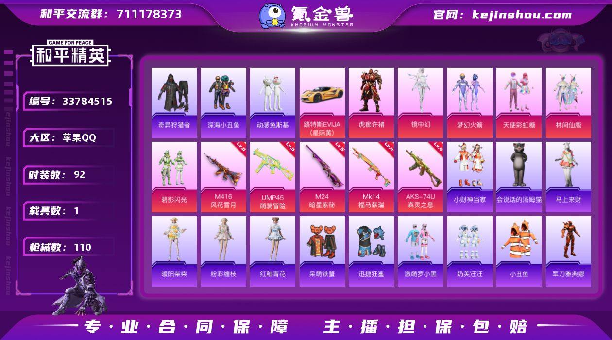 苹果手Q-6粉装-5特效枪-1载具-3粉色飞行器-40560热力值-6王牌印记-92套装-110枪皮 【热门品类】:粉装-梦幻火箭,套装-深海小丑鱼,套装-小丑鱼,套装-奇异狩猎者,角色-军刀雅典娜,套装-动感兔斯基人偶服 【粉色套装】:粉装-天使彩虹糖,粉装-梦幻火箭,粉装-林间仙鹿,粉装-碧影闪光,角色-镜中幻,角色-虎痴许褚 【粉色枪皮等级】:M416-风花雪月(六级),UMP45-萌骑冒险(五级),AKS-74U-森灵之息(四级),M24-暗星紫秘(五级),Mk14-福马献瑞(四级) 【粉色载具】:路特斯EVIJA(星际黄) 【粉色枪皮】:M416-风花雪月,UMP45-萌骑冒险,AKS-74U-森灵之息,M24-暗星紫秘,Mk14-福马献瑞 【粉色飞行器】:香车宝马飞行器,绿意幻情飞行器,幻海精灵飞行器 【粉色降落伞】:甜心宝贝降落伞,梦幻火箭降落伞,林间仙鹿降落伞,洛神天依降落伞,风花雪月降落伞,蓝莓炮弹降落伞,甜心娃娃降落伞,橘柚倾心降落伞,仲夏莫吉托降落伞,闲梦青缨降落伞,沙丘之主降落伞,金丰海韵降落伞,异瞳寒姬降落伞 【稀有套装】:套装-小财神当家,套装-马上来财,角色-绛羽幽主,套装-粉彩缠枝,套装-雨过天青,套装-红釉青花,角色-暖阳柴柴,玩偶服-会说话的汤姆猫 【稀有枪皮】:AKM-彩虹...