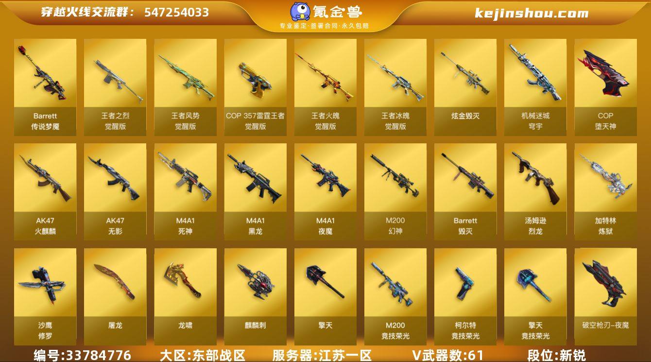 江苏一区-69V-6王者武器数-1炫金武器数 【传说武器】:传说梦魇 【热门武器】:传说梦魇,M200-幻神,M200-竞技荣光,死亡之眼,汤姆逊-烈龙*6,加特林-炼狱,裁决-雪莉杨,COP-堕天神*3,沙鹰-修罗 【王者炫金武器】:炫金毁灭 【角色】:凌霄,电竞教官-云悠悠,王者葵-惊若翩鸿,暗夜-X,风暴女,麻雀,青霞仙子,蜀雪,新娜塔莎,影武者-X 【人偶武器】:裁决-雪莉杨,M37-葵,迷你牛牛*6 【暴走生化】:死亡之眼 【挑战大师】:激光毁灭者III-白马银枪,VEPR-12-金魔 【英雄级武器】:AK47-火麒麟,M4A1-黑龙,AK47-无影,M4A1-死神,M4A1-夜魔,王者冰魄-觉醒版,王者火魄-觉醒版,王者之烈-觉醒版,王者风势-觉醒版,机械迷城-穹宇,Barrett-毁灭,M200-幻神,M200-竞技荣光,加特林-炼狱,悦蓝-惊涛骇浪-觉醒版,汤姆逊-烈龙*6,沙鹰-修罗,COP-堕天神*3,COP 357-雷霆王者-觉醒版,柯尔特-竞技荣光,破空枪刃-夜魔*3,屠龙*3,龙啸,马来剑-夜魔,擎天,麒麟刺,擎天-竞技荣光*2,高爆手雷-夜魔*7,高爆手雷-竞技荣光*2,闪光弹-夜魔*7,闪光弹-竞技荣光*2,烟雾弹-夜魔*7,烟雾弹-竞技荣光*2 【其他武器】:源·火麒麟,魂·火麒麟-百城,源-黑龙,源·雷神*2,魂·M4A1...