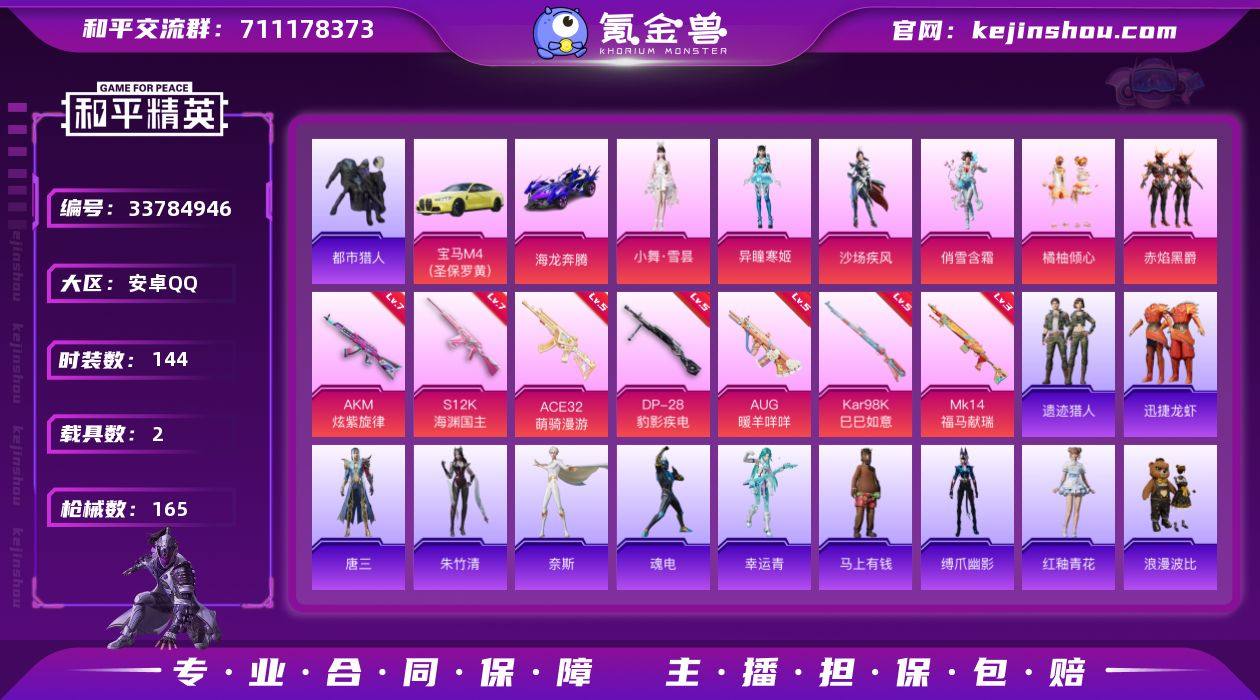 安卓 手Q-6粉装-7特效枪-2载具-2粉色飞行器-54471热力值-11王牌印记-144套装-165枪皮 【热门品类】:套装-浪漫天命,套装-都市猎人,套装-AG战队服,套装-浪漫波比 【粉色套装】:粉装-沙场疾风,粉装-俏雪含霜,粉装-橘柚倾心,粉装-赤焰黑爵,角色-异瞳寒姬,人物-小舞·雪昙 【粉色枪皮等级】:AKM-炫紫旋律(七级),AUG-暖羊咩咩(五级),ACE32-萌骑漫游(五级),Kar98K-巳巳如意(五级),Mk14-福马献瑞(三级),S12K-海渊国主(七级),DP-28-豹影疾电(五级) 【粉色载具】:宝马M4(圣保罗黄),海龙奔腾 【粉色枪皮】:AKM-炫紫旋律,AUG-暖羊咩咩,ACE32-萌骑漫游,Kar98K-巳巳如意,Mk14-福马献瑞,S12K-海渊国主,DP-28-豹影疾电 【粉色飞行器】:炫彩糖果飞行器,冷魅冰骑飞行器 【粉色降落伞】:极限特训降落伞,未来战士降落伞,海渊国主降落伞,暗星紫秘降落伞,恐龙拽拽降落伞,橘柚倾心降落伞,炫彩糖果降落伞,千仞雪降落伞 【稀有套装】:套装-炫彩糖果,角色-奈斯,角色-魂电,角色-幸运青,套装-马上有钱,套装-迅捷龙虾,套装-遗迹猎人,套装-闪电轻猫,角色-蜜桃派对,角色-琉璃花蕾,套装-霓虹热舞,套装-雨过天青,套装-红釉青花,角色-缚爪幽影,角色-唐三,...