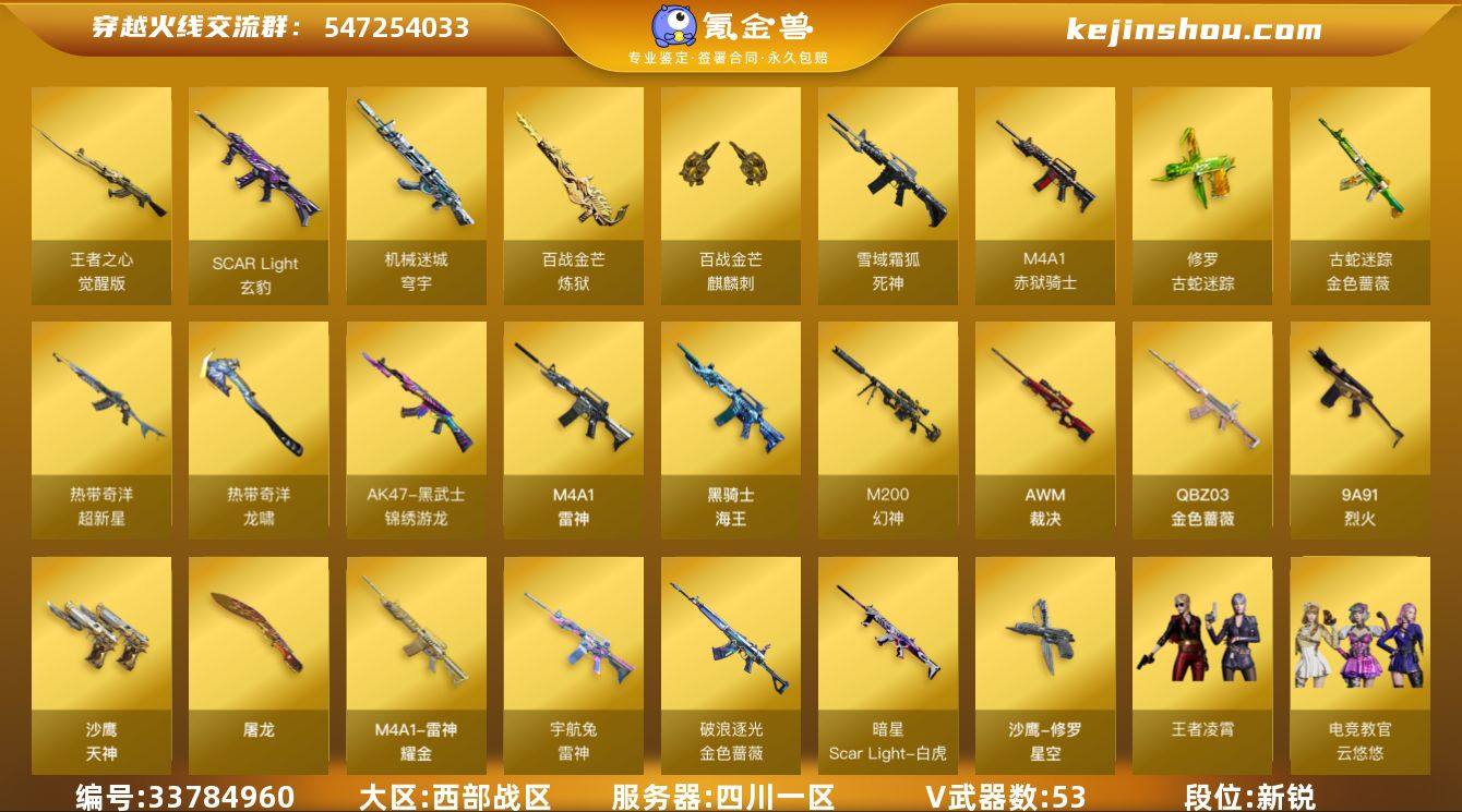 【ky7137】四川一区-54V-4王者武器数-0炫金武器数 【热门武器】:QBZ03-金色蔷薇,M200-幻神,金色蔷薇-古蛇迷踪,修罗-古蛇迷踪 【王者炫金武器】:高爆手雷-雷霆王者 【音效卡】:炼狱-百战金芒-庆典舞曲音效卡,死神-雪域霜狐-怀旧音效卡 【皮肤】:幻神-丹凤,幻神-汪汪小队 皮肤,裁决-羽掣 皮肤,裁决-运输船 皮肤,Scar Light-白虎-暗星,金色蔷薇-破浪逐光 皮肤,雷神-耀金皮肤,雷神-宇航兔皮肤,M4A1-再燃火线,烈火-萌兔 皮肤,修罗-星空,轻型军用手斧-再燃火线 【角色】:电竞教官-云悠悠,岚兮儿,零·纪元,战地猎狐,王者凌霄,雪域霜狐,蛇隐宗,奇洋探员,葵-阿尔法武装,暗夜-X,初恋灵狐,飞虎队-X,风暴女,兰妹妹,0号玩家,曼陀罗-X,潘多拉-X,蛇姬,潘多拉-N 【人偶武器】:生化手雷-机甲核心 【暴走生化】:超级对讲机 【英雄级武器】:M4A1-雷神*3,QBZ03-金色蔷薇,黑武士-锦绣游龙,超新星-热带奇洋,金色蔷薇-古蛇迷踪,死神-雪域霜狐,SCAR Light-玄豹,9A91-烈火,王者之心-觉醒版,黑骑士-海王,机械迷城-穹宇,AWM-裁决,M200-幻神,炼狱-百战金芒,沙鹰-天神*2,修罗-古蛇迷踪,屠龙,龙啸-热带奇洋,麒麟刺-百战金芒,丛林匕首-玄豹*2,高...