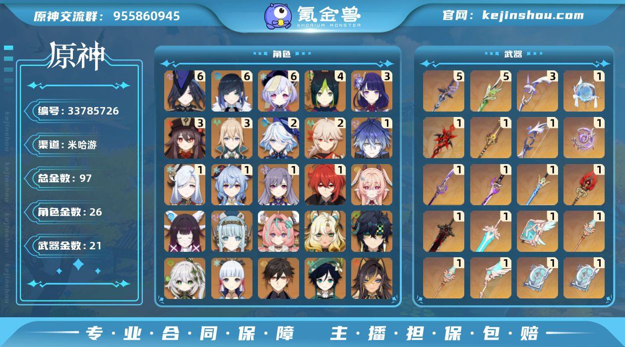 6+5克洛琳德 6+1夜兰 二命水神 2+1万叶 三加一胡桃和将军 雷九万班 胡行钟夜配对齐全 一命菲林斯配上0+1月神和伊涅芙月感电也齐全,还有小一个月的月卡,一把精五的裁叶萃光