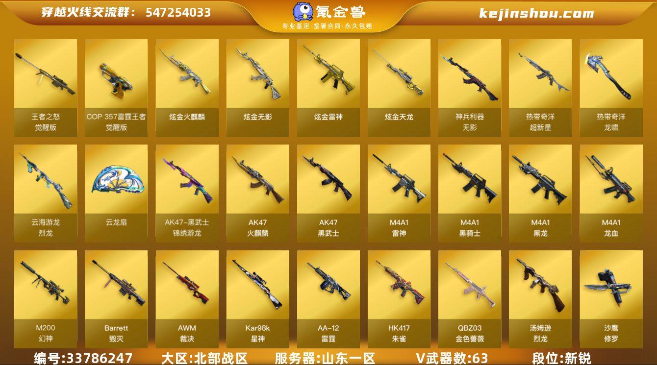 山东一区-69V-4王者武器数-4炫金武器数 【热门武器】:QBZ03-金色蔷薇,HK417-朱雀,M200-幻神,死亡之眼,Kar98K-星神,M4A1-黑骑士,汤姆逊-烈龙*6,斯泰尔-蝴蝶,羊驼玩偶,毁灭-孙三炮,沙鹰-修罗*3 【王者炫金武器】:炫金火麒麟,炫金无影,炫金雷神,炫金天龙 【音效卡】:Kar98K-星神音效卡,HK417-朱雀音效卡,AK47-火麒麟音效卡,M4A1-黑骑士音效卡,Barrett-毁灭音效卡,天罚-斗烈龙驹-斗烈音效卡,屠龙-斗烈龙驹-斗烈音效卡 【皮肤】:幻神-冠军之幻,幻神-宠儿-2021MVP,Kar98K-星神-冠军之星皮肤,AWM-裁决-凤灵皮肤,雷神-暗月,雷神-传奇N9,雷神-R.LGD-CFPLS18冠军,火麒麟-心动糖果,毁灭-英雄计划 皮肤,黑龙-墨子皮肤,修罗-冠军之魂,龙啸-冠军之啸 【角色】:瞳,兰-巾帼英雄,隼,太空指挥官,王者凌霄,奇洋探员,乔伊教练,修道士,云海玲珑,斗烈龙骑,飞虎队-X,风暴女,嘉年华灵狐,兰-新年限定,灵狐者-X,龙儿,麻雀,曼陀罗-X,蛇姬,斯沃特-X,铁骑荣耀,新娜塔莎,团团 【人偶武器】:毁灭-孙三炮,白虎-迷你小艾,火麒麟-灵狐,雷神-枪娘蕾安娜,迷你宝贝,迷你钢铁终结者,斯泰尔-蝴蝶,迷你地狱终结者,AWM-灵狐-15周年嘉年华,迷你裂空...