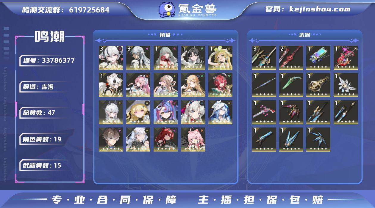 80级/47黄/女主/19个五星角色/15个五星武器 未绑定,爱弥斯,赞妮,夏空,卡提希娅,弗洛洛,琳奈,菲比,椿,今汐,珂莱塔,洛可可,守岸人,相里要,吟霖,维里奈,卡卡罗,鉴心,安可,凌阳,脉冲协臂,幽冥的忘忧章,不屈命定之冠,焰光裁定,林间的咏叹调,血誓盟约,和光回唱,死与舞,裁春,掣傀之手,浩境粼光,千古洑流,停驻之烟,擎渊怒涛,漪澜浮录,3命椿,3命卡卡罗,1命弗洛洛,1命维里奈,1命鉴心,1命凌阳,0命爱弥斯,0命赞妮,0命夏空,0命卡提希娅,0命琳奈,0命菲比,0命今汐,0命珂莱塔,0命洛可可,0命守岸人,0命相里要,0命吟霖,0命安可,精3血誓盟约,精2裁春,精1脉冲协臂,精1幽冥的忘忧章,精1不屈命定之冠,精1焰光裁定,精1林间的咏叹调,精1和光回唱,精1死与舞,精1掣傀之手,精1浩境粼光,精1千古洑流,精1停驻之烟,精1擎渊怒涛,精1漪澜浮录