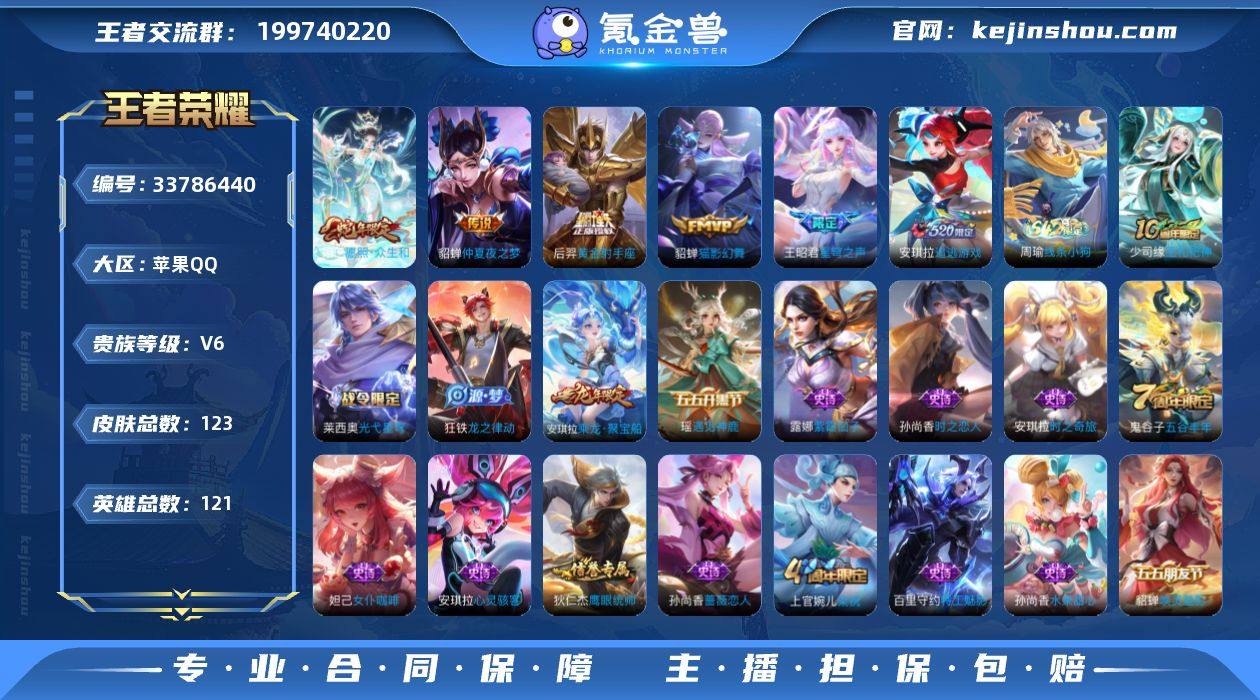 实名: 可修改 性别: 女号 贵族等级: V6 英雄数: 121 皮肤数: 123 传说皮: 黄金射手座,猫影幻舞,仲夏夜之梦,追逃游戏(安琪拉) 限定皮: 梁祝,星穹之声,五谷丰年,愿照·众生和 亮点: 【优质装备】:黄金射手座,猫影幻舞,仲夏夜之梦(大飞蛾),追逃游戏(安琪拉)
