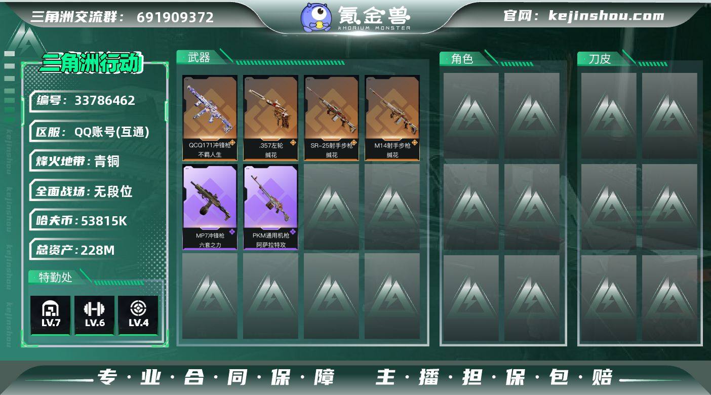 【SJZG5014】总资产228M/哈夫币5381万/传说枪皮数4/战场等级1/行动等级60/安全箱等时效性道具以游戏内数据为准,详情请看图/近战-黑鹰/QCQ171冲锋枪-不羁人生/M14射手步枪-缄花/SR-25射手步枪-缄花/.357左轮-缄花/MP7冲锋枪-六套之力/PKM通用机枪-阿萨拉特攻/ AK-12突击步枪-马年新春/Vector冲锋枪-先锋/M1014霰弹枪-幻影结构/M4A1突击步枪-粉色涂装/腾龙突击步枪-三角洲力量/K416突击步枪-高雅黑/AUG突击步枪-浅蓝涂装/M7战斗步枪-黑巧甜心/SG552突击步枪-狂欢/G3战斗步枪-高雅黑/CAR-15突击步枪-狂欢/AS Val突击步枪-黑巧甜心/MP5冲锋枪-海色/UZI冲锋枪-海色/M1014霰弹枪-高雅黑/M1014霰弹枪-重击/杠杆式步枪-出货/QJB201轻机枪-典雅/QJB201轻机枪-玲珑/SVD狙击步枪-高雅黑/SR-25射手步枪-黑巧甜心/SR9射手步枪-出货/沙漠之鹰-海浪/挂饰-魔术师/挂饰-福禄/挂饰-聚宝盆/挂饰-隐者/挂饰-缄花/挂饰-麻将/挂饰-星象仪