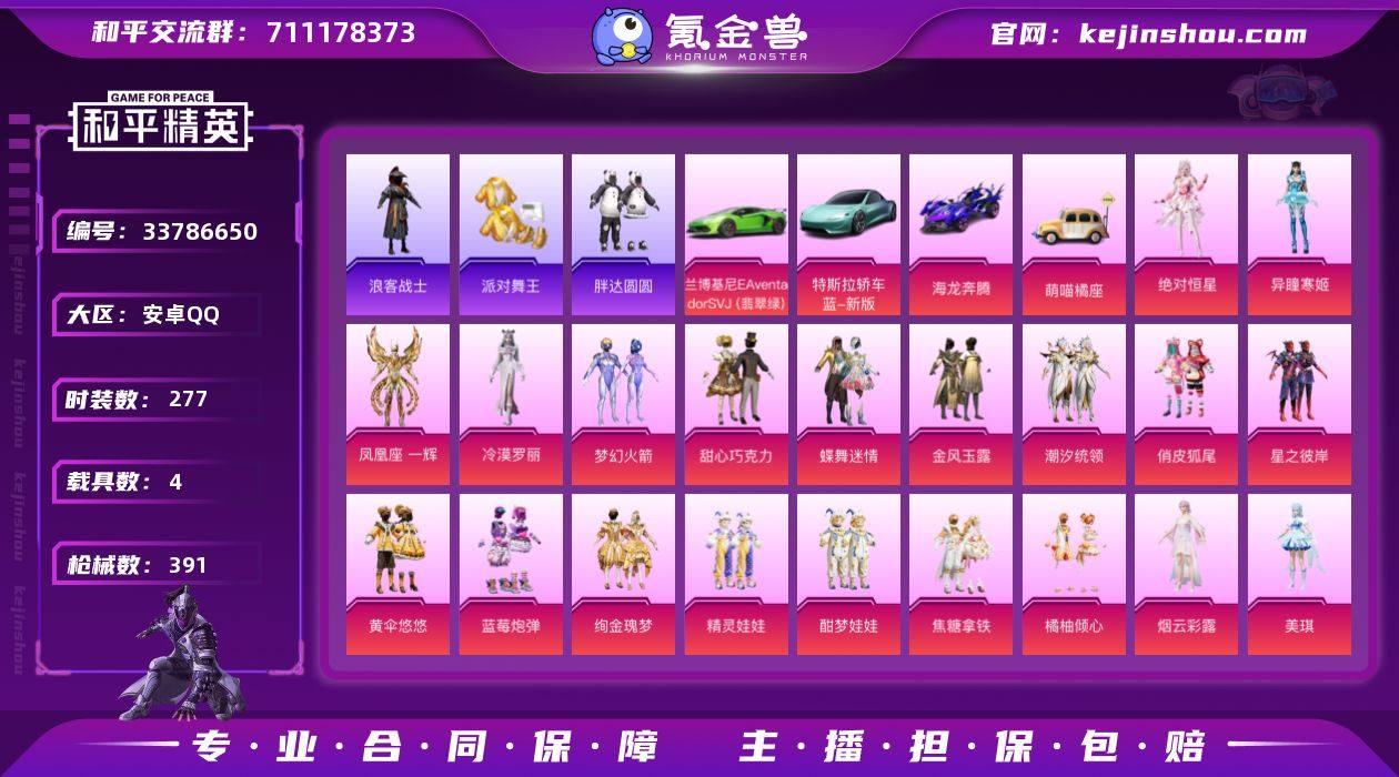 23粉装 9粉枪 4载具 3稀有装备 277套装 391枪皮 87热门 兰博基尼Aventador SVJ(翡翠绿) 特斯拉Roadster(水滴蓝) 海龙奔腾 萌喵橘座 派对舞王(金靴子) 浪客战士 稀有紫装-浪客战士 梦幻火箭 稀有紫装-派对舞王(金靴子) 甜心巧克力 缤纷油彩(猪脸妹) 星之彼岸 焦糖拿铁 绚金瑰梦 蓝莓炮弹 蝶舞迷情 酣梦娃娃 精灵娃娃 橘柚倾心 绝对恒星 深蓝冒险家 迷域探索者 暗影爵士 暗黑裁决 星河入梦 滨海厨神 吉莉礼服 智慧隐士 北国孤狼 幻羽潜行 虎虎生威吉莉 玲珑飞花 核芯基因 精神漫游 空投萌叽 智慧之神 极速竞梦 炫蓝之夏 萌黄之夏 玩偶服-菲菲 猎梦纪元 超能拳王 拳皇97草薙京 炽焰拳师 格斗专家 牛气满满 云纹魔法士 青春冒险家 潮流游乐家 原初圣火 逆风勇士 天籁歌者 萌趣颜团子 电音精灵 摇滚狂鲨 银白舞王 耀粉歌者 治愈之星 科技之星 浪漫樱花 飞行日记 暗夜魅影 焰山流火 福星高照 神气柴柴 绿翡凌光 暗夜傀儡 幻彩翩翩 初火先锋 柠萌假日 王牌教练 冰爽风暴 飞驰魅影 龟仙人 音速流光 冰川谧蓝 涂山之恋 浓情摩卡 冷焰舞者 爆裂葡萄 魔力冰咖 空岛之星 月蓝流光 狂战萌兔 萌趣咩咩 竞技名士 娇憨猪猪 红酒骑士 极乐追光 龙的传人 冰暴轰轰 玉兔迎春 快闪甜心 特...