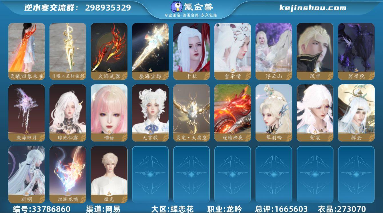 稀有外观: 微光,炽渊龙啸 天赏石外观: 白发千秋,火焰武器,白发雪牵情,金发浮云山,天曦四象朱雀,黑狮冥夜猊,金发风华,日曜八荒·轩辕剑,蜃海尘踪,白发祈明,白发挥云,紫宸,翠羽吟,逐暗沸夜,喵语,无言歌,琼池仙露,灵宠·天鹰座,潋海琼月(水母武器),烟霏玉【区服】 明月天涯 【充值称号】 把酒临风 【已用天赏石】 24 【转盘外观】 微光, 炽渊龙啸 【稀有道具】 未用天赏石 【天赏发型】 浮云山, 琼池仙露, 雪牵情, 无言歌, 千秋, 烟霏玉, 喵语, 翠羽吟, 紫宸, 挥云, 祈明, 风华 【天赏祥瑞】 逐暗沸夜, 冥夜猊 【天赏外观】 火焰武器, 水母武器, 海市蜃楼武器, 天曦四象·朱雀, 日曜八荒·轩辕剑 【天赏灵宠】 灵宠·天鹰座 【配饰】 灵尾绰 【商城外观】 夜雪闻梅, 曙光探影, 幽梦逢她, 玉华拈香, 云绣露华, 紫渊龙堂, 云腾游雾, 不负卿愿, 甜宙漫游, 纯白月光, 云锦天香, 金筹曜夜, 逸夏浮澜, 羽信絮梦, 云梦萤星, 司玄镇天, 千星咏叹, 跃动心芒, 朔雪从风, 灼金喵影, 侠影流霜, 灵语星彩, 凤亭骁野, 晴岸涛吟, 斗墨金枢, 玄喵夜行, 鳞骨逢幽, 贪狼摄星, 青林雀舞, 开阳执戈, 紫微御宵, 蓬海沧歌, 兰亭觞咏, 逆鳞浊日, 火鸾鸿衣, 瀚渊龙炎, 曦照东晖, 金祷颂晖, 玉泽凌烟, 赤狐魅语,...