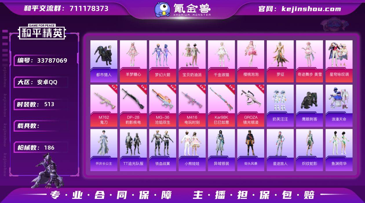 【特价出售】钱包无法注销安卓Q-2稀有8粉装7特效枪8热门135套装186枪皮 56917热力值 6印记 历史卓越王牌17星 【2稀有】 都市猎人 浪漫天命 【8粉装】 梦幻火箭 奇迹舞步美雪 宝贝奶油派 千金淑猫 罗征 樱桃泡泡 星穹咏叹调 羊梦糖心 【7特效枪】 M416-电玩时刻 (5级) Kar98K-巳巳如意 (5级) M762-鬼刀 (7级) MG-36-沧焰双生 (5级) DP-28-豹影疾电 (5级) GROZA-镜光银凌 (5级) ACE32-萌骑漫游 (5级) 【8热门】 Mark.06 龟仙人 鹰眼刺客 奶芙汪汪 TT追光队服 漫步者 M762-奇异狩猎者 S686-奇异狩猎者 【1飞行器】 梦幻火箭飞行器 【1头盔】 梦幻火箭头盔 【1背包】 梦幻火箭背包