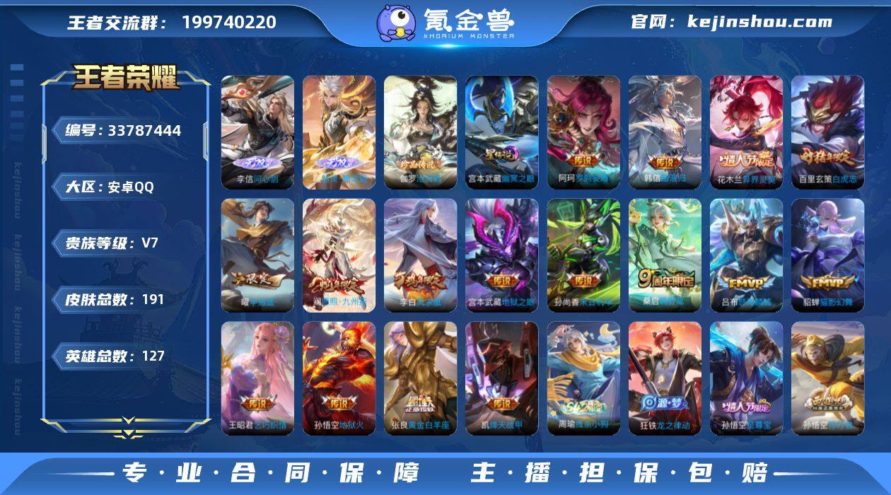 MCK634512 【李信+曜双无双!白虎志!凤求凰!】 皮肤数量191 印记总数0 【V7】 【永恒钻石】 【不可修改】 账号类型3 无双2 珍品1 星元皮肤1 传说16 史诗54 账号类型:射手号,上单号,打野号; 无双:曜_器灵螭龙剑,李信_问心剑; 珍品:伽罗_沧流箭; 星元皮肤:宫本武藏_幽冥之眼; 传说:铠_绛天战甲,百里玄策_白虎志,韩信_踏浪归,花木兰_异界灵契,阿轲_罗刹妄海,孙尚香_末日机甲,张良_黄金白羊座,李白_凤求凰,王昭君_乞巧织情,貂蝉_猫影幻舞,宫本武藏_地狱之眼,曜_李逍遥,孙悟空_地狱火,吕布_怒海麟威,桑启_鸣野蒿,澜_愿照九州拓; 史诗:海月_海之女神,娜可露露_晚萤,蔡文姬_舞动绿茵,孙尚香_时之恋人,露娜_紫霞仙子,狂铁_龙之律动,夏侯惇_乘风破浪,百里守约_特工魅影,周瑜_线条小狗,项羽_苍穹之光,宫本武藏_鬼剑武藏,澜_赏金猎手,刘邦_德古拉伯爵,嫦娥_拒霜思,嬴政_优雅恋人,庄周_高山流水,干将莫邪_真爱魔法,猪八戒_猪悟能,墨子_金属风暴,孙悟空_孙行者,白起_星夜王子,伽罗_天狼溯光者,狄仁杰_魔术师,百里玄策_热力回旋,橘右京_修罗,诸葛亮_黄金分割率,兰陵王_暗隐猎兽者,元歌_云间偶戏,云中君_纤云弄巧,吕布_圣诞狂欢...