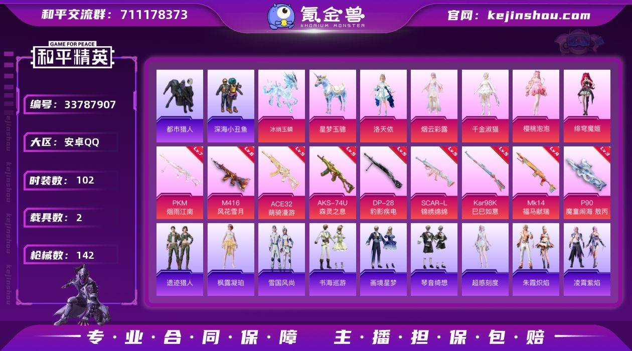 【kyhp1995】安卓 手Q-5粉装-9特效枪-2载具-4粉色飞行器-47758热力值-9王牌印记-102套装-142枪皮 【热门品类】:套装-都市猎人,套装-深海小丑鱼,套装-龟仙人 【粉色套装】:角色-洛天依,角色-烟云彩露,角色-千金淑猫,角色-樱桃泡泡,角色-绯穹魔姬 【粉色枪皮等级】:SCAR-L-锦绣绵绵(五级),M416-风花雪月(六级),ACE32-萌骑漫游(五级),AKS-74U-森灵之息(五级),P90-魔童闹海 敖丙(三级),Kar98K-巳巳如意(五级),Mk14-福马献瑞(四级),DP-28-豹影疾电(五级),PKM-江南烟雨(七级) 【粉色载具】:星梦玉骢,冰绡玉鳞 【粉色枪皮】:SCAR-L-锦绣绵绵,M416-风花雪月,ACE32-萌骑漫游,AKS-74U-森灵之息,P90-魔童闹海 敖丙,Kar98K-巳巳如意,Mk14-福马献瑞,DP-28-豹影疾电,PKM-江南烟雨 【粉色飞行器】:炫彩糖果飞行器,动力核心飞行器,灵珠游龙飞行器 【粉色降落伞】:第五大道降落伞,江南烟雨降落伞,精灵梦叶罗丽降落伞,千金淑猫降落伞,鬼刀降落伞,樱桃泡泡降落伞,星穹咏叹调降落伞,幻彩电音降落伞,时光之誓降落伞,魔童闹海 敖丙降落伞,炫彩糖果降落伞 【稀有套装】:套装-龟仙人,套装-绒宝小鹅,角色-超感刻度,套装-雪国风尚,套装-炫彩糖果,套装-...