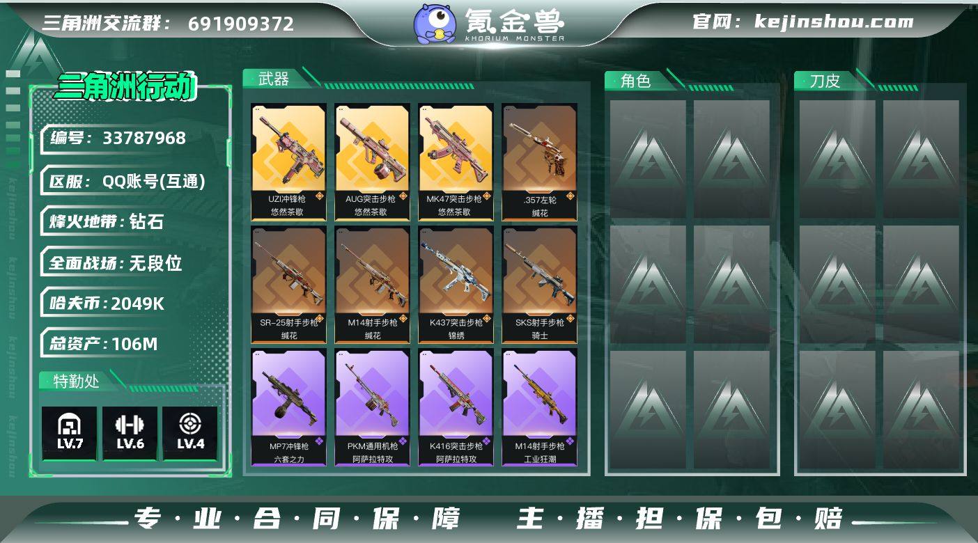 【SJZG5017】总资产106M/哈夫币204万/传说枪皮数8/战场等级5/行动等级60/安全箱等时效性道具以游戏内数据为准,详情请看图/近战-黑鹰/AUG突击步枪-悠然茶歇/K437突击步枪-锦绣/MK47突击步枪-悠然茶歇/UZI冲锋枪-悠然茶歇/M14射手步枪-缄花/SKS射手步枪-骑士/SR-25射手步枪-缄花/.357左轮-缄花/K416突击步枪-冬日风情/K416突击步枪-阿萨拉特攻/G3战斗步枪-哈夫克警备/MP7冲锋枪-六套之力/PKM通用机枪-阿萨拉特攻/QJB201轻机枪-炽焰/M14射手步枪-工业狂潮/SV-98狙击步枪-囚徒/SV98狙击步枪-猎鳄行动/M700狙击步枪-哈夫克警备/AS Val突击步枪-休闲时光/AKM突击步枪-肃杀/K416突击步枪-一帆风顺/SG552突击步枪-2026/SG552突击步枪-贴花艺术/ AK-12突击步枪-马年新春/SCAR-H战斗步枪-荣耀列队/MP5冲锋枪-哈夫克卫队/Vector冲锋枪-先锋/SMG-45冲锋枪-行动开启/SMG-45冲锋枪-幻影结构/勇士冲锋枪-冰天雪地/QCQ171冲锋枪-银鹭/M1014霰弹枪-幻影结构/S12K霰弹枪-地狱黑鲨/M249轻机枪-冰天雪地/QJB201轻机枪-哈夫克卫队/SKS射手步枪-弄臣/SR-25射手步枪-开拓/QSZ92G-一帆风顺/G18-星链科技/G18-哈夫克航天/M16A4突击步枪-斑马/K437突击步枪-斑马/SKS射手步枪-彩墨涂鸦/M4A1突击步枪-粉色...