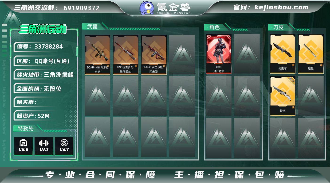 总资产:52.6M 1干员外观 3近战传说 26传说枪械 哈夫币:477.861K 不可二次 不可修改实名 无违规 【烽火地带段位】三角洲巅峰 【全面战场段位】无段位 【干员外观】骇爪-维什戴尔 【传说武器皮肤】近战武器-暗星,近战武器-处刑者,近战-怜悯,AS Val突击步枪-悬赏令(典藏),SG552突击步枪-运动员,S12K霰弹枪-死神玫瑰,R93狙击步枪-维什戴尔,AS Val突击步枪-死神玫瑰,SCAR-H战斗步枪-启航,KC17突击步枪-电锯惊魂,SKS射手步枪-骑士,腾龙突击步枪-死神玫瑰,AKM突击步枪-锦绣,47突击步枪-悠然茶歇,AUG突击步枪-悠然茶歇,UZI冲锋枪-悠然茶歇,SMG-45冲锋枪-锦绣,QCQ171冲锋枪-不羁人生,K437突击步枪-锦绣,M14射手步枪-缄花,47突击步枪-暗星,SR-3M紧凑突击步枪-暗星,M14射手步枪-蛮荒,SR-25射手步枪-缄花,.357左轮-缄花,M4A1突击步枪-阿米娅