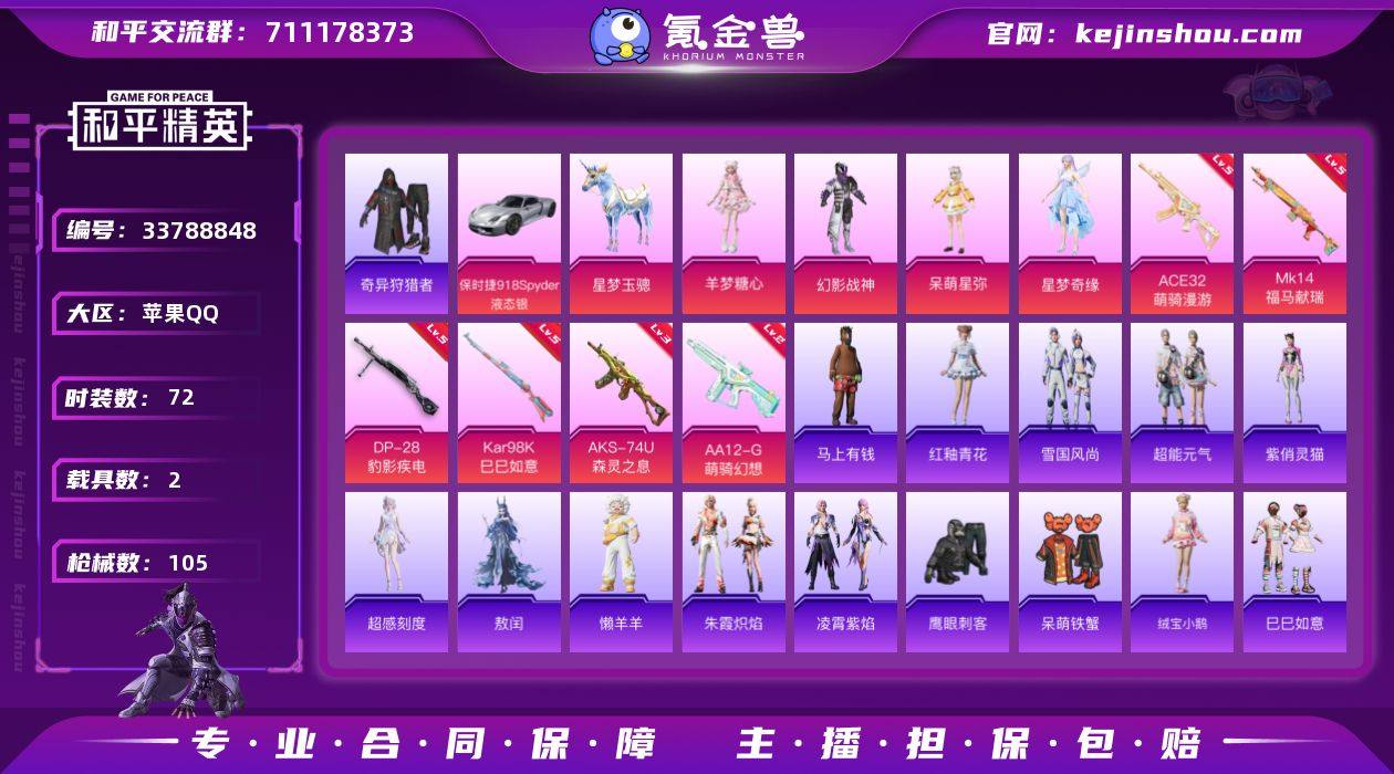 【地铁满天赋·妹妹号·幻影战神·星梦奇缘·羊梦糖心·2载具·星梦玉骢·保时捷918 Spyder(液态银)】苹果 手Q-4粉装-6特效枪-2载具-2粉色飞行器-30298热力值-1王牌印记-72套装-105枪皮 【热门品类】:套装-奇异狩猎者 【粉色套装】:粉装-幻影战神,角色-呆萌星弥,角色-星梦奇缘,角色-羊梦糖心 【粉色枪皮等级】:ACE32-萌骑漫游(五级),AKS-74U-森灵之息(三级),Kar98K-巳巳如意(五级),Mk14-福马献瑞(五级),AA12-G-萌骑幻想(二级),DP-28-豹影疾电(五级) 【粉色载具】:保时捷918 Spyder(液态银),星梦玉骢 【粉色枪皮】:ACE32-萌骑漫游,AKS-74U-森灵之息,Kar98K-巳巳如意,Mk14-福马献瑞,AA12-G-萌骑幻想,DP-28-豹影疾电 【粉色飞行器】:炫彩糖果飞行器,星梦奇缘飞行器 【粉色降落伞】:绝对恒星降落伞,洛神天依降落伞,星梦奇缘降落伞,千金淑猫降落伞,晶梦幻蝶降落伞,雪月幻音降落伞,喜羊羊与灰太狼降落伞,异瞳寒姬降落伞,炫彩糖果降落伞 【稀有套装】:套装-绒宝小鹅,套装-巳巳如意,套装-超能元气,角色-超感刻度,套装-雪国风尚,套装-炫彩糖果,套装-马上有钱,套装-糖糖葫芦,套装-青团波波,套装-棉花软糖,角色-摩登魅猫,玩偶服-小狗蛇点点,套装...