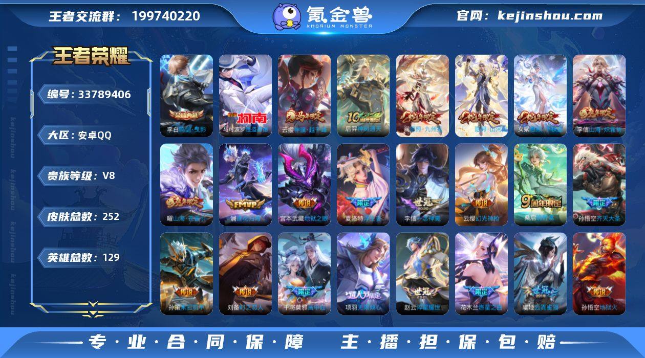 【Ewz763】【9位数QQ号 李白典藏,马可波罗怪盗基德,24个性按键,荣耀水晶幸运值259,秒换绑】 ,安卓Q-V8-至尊星耀IV段位-129英雄-252皮肤-1典藏皮肤-1珍品传说-25传说-69史诗 【英雄全皮】:孙权全皮,夏洛特全皮,司空震全皮,赵怀真全皮 【荣耀典藏】:李白鸣剑曳影 【珍品传说】:马可波罗怪盗基德 【传说皮肤】:云缨神骥越千峰,后羿神树通天,司空震愿照山河定,女娲愿照千秋盛,澜愿照九州拓,云缨幻光神枪,桑启鸣野蒿,澜逐花归海,夏洛特浮生妄,干将莫邪画中仙,花木兰燃星之曲,项羽无限倾心,孙悟空齐天大圣,曜山海苍雷引,李信山海炽霜斩,孙策末日机甲,赵云淬星耀世,李元芳飞鸢探春,铠绛天战甲,虞姬启明星使,李信一念神魔,刘备时之恋人,虞姬云霓雀翎,宫本武藏地狱之眼,孙悟空地狱火 【限定皮肤】:姜子牙天穹之誓,狄仁杰阴阳师,赵云皇家上将,鲁班七号乒乒小将,高渐离玩趣恶龙,阿轲迷踪丽影,元歌无心,马可波罗山海玄木吟,狄仁杰魔术师,达摩沙漠行僧,项羽海滩派对,项羽无限倾心,韩信飞衡,兰陵王金庭之子,花木兰燃星之曲,孙悟空齐天大圣,刘备百相守梦,李元芳银河之约,李元芳云中旅人,虞姬启明星使,钟馗驱傩正仪,干将莫邪胡桃夹...
