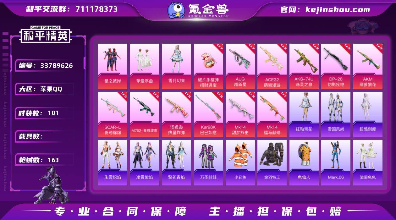 苹果手Q-3粉装-12特效枪-3粉色飞行器-46497热力值-5王牌印记-101套装-163枪皮 【热门品类】:套装-小丑鱼,套装-金羽特工,套装-龟仙人,角色-Mark.06 【粉色套装】:粉装-星之彼岸,粉装-挚爱序曲,粉装-雪月幻音 【粉色枪皮等级】:AKM-绿萝繁花(五级),SCAR-L-锦绣绵绵(五级),AUG-超新星(七级),M762-青锋波束(五级),ACE32-萌骑漫游(五级),汤姆逊-热量炸弹(五级),AKS-74U-森灵之息(五级),Kar98K-巳巳如意(五级),Mk14-甜梦熊击(五级),Mk14-福马献瑞(一级),DP-28-豹影疾电(五级),破片手榴弹-招财进宝(七级) 【粉色枪皮】:AKM-绿萝繁花,SCAR-L-锦绣绵绵,AUG-超新星,M762-青锋波束,ACE32-萌骑漫游,汤姆逊-热量炸弹,AKS-74U-森灵之息,Kar98K-巳巳如意,Mk14-甜梦熊击,Mk14-福马献瑞,DP-28-豹影疾电,破片手榴弹-招财进宝 【粉色飞行器】:炫彩糖果飞行器,彩虹独角兽飞行器,月下星之子飞行器 【粉色降落伞】:心之恋语降落伞,星之彼岸降落伞,闲梦青缨降落伞,江南烟雨降落伞,彩虹独角兽降落伞,圣斗士星矢降落伞,幻彩电音降落伞,冷漠罗丽降落伞,魔童闹海 敖丙降落伞,炫彩糖果降落伞,辉光之愿降落伞 【稀有套装】:套装-龟仙人,角色-超感刻度,套装...
