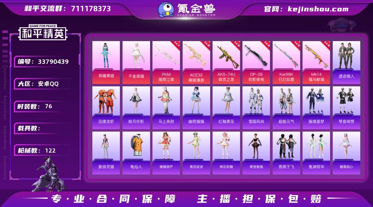 安卓手Q-2粉装-6特效枪-3粉色飞行器-33900热力值-2王牌印记-76套装-122枪皮 【热门品类】:套装-龟仙人 【粉色套装】:角色-千金淑猫,角色-异瞳寒姬 【粉色枪皮等级】:ACE32-萌骑漫游(五级),AKS-74U-森灵之息(五级),Kar98K-巳巳如意(五级),Mk14-福马献瑞(四级),DP-28-豹影疾电(五级),PKM-江南烟雨(七级) 【粉色枪皮】:ACE32-萌骑漫游,AKS-74U-森灵之息,Kar98K-巳巳如意,Mk14-福马献瑞,DP-28-豹影疾电,PKM-江南烟雨 【粉色飞行器】:炫彩糖果飞行器,萌物绒绒飞行器,英伦信使飞行器 【粉色降落伞】:精灵梦叶罗丽降落伞,金丰海韵降落伞,千金淑猫降落伞,炫彩糖果降落伞,罪夜之冕降落伞,鸢尾珑雾降落伞 【稀有套装】:套装-龟仙人,套装-超能元气,套装-雪国风尚,套装-炫彩糖果,套装-马上来财,套装-迅捷龙虾,套装-遗迹猎人,套装-糖糖葫芦,套装-青团波波,套装-棉花软糖,角色-摩登魅猫,套装-燕燕于飞,套装-鱼渊荷华,角色-糖霜甜心,角色-紫俏灵猫,套装-画境星梦,套装-琴音绮想,套装-雨过天青,套装-红釉青花,角色-幽雨猫猫,角色-皓月伶影 【稀有枪皮】:AUG-冰晶雪宝,AKM-夜灯,AKM-破晓战魂,AKM-龙的传人,SCAR-L-炫彩节奏,M416-红色方程式...