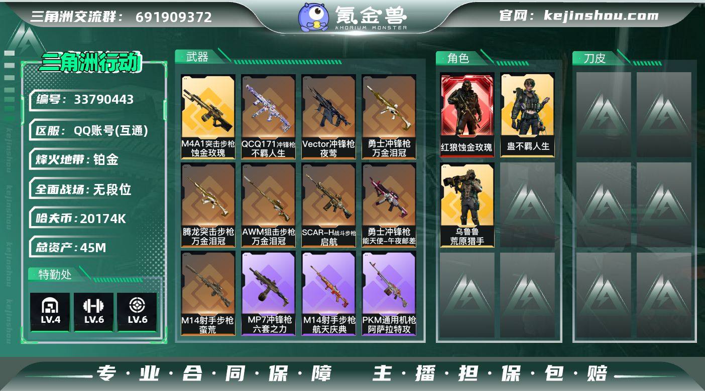 【SJ10291】总资产45M/哈夫币2017万/传说枪皮数9/战场等级5/行动等级60/安全箱等时效性道具以游戏内数据为准,详情请看图/红狼-蚀金玫瑰/乌鲁鲁-荒原猎手/蛊-不羁人生/近战-黑鹰/M4A1突击步枪-蚀金玫瑰/SCAR-H战斗步枪-启航/腾龙突击步枪-万金泪冠/Vector冲锋枪-夜莺/勇士冲锋枪-能天使-午夜邮差/勇士冲锋枪-万金泪冠/QCQ171冲锋枪-不羁人生/M14射手步枪-蛮荒/AWM狙击步枪-万金泪冠/AKM突击步枪-林中猎手/K416突击步枪-腊梅/M16A4突击步枪-竞赛选手/AUG突击步枪-蝮蛇/SG552突击步枪-哈夫克警备/G3战斗步枪-哈夫克警备/腾龙突击步枪-猎鳄行动/K437突击步枪-丛林谍踪/SR-3M紧凑突击步枪-战术竞备/SR-3M紧凑突击步枪-开工大吉/勇士冲锋枪-工业狂潮/勇士冲锋枪-丛林谍踪/MP7冲锋枪-六套之力/M1014霰弹枪-林中猎手/PKM通用机枪-阿萨拉特攻/M249轻机枪-丛林谍踪/QJB201轻机枪-炽焰/VSS射手步枪-丛林谍踪/SVD狙击步枪-暗夜猎手/M14射手步枪-航天庆典/M700狙击步枪-竞技风/M700狙击步枪-蝮蛇/沙漠之鹰-曙光/沙漠之鹰-天际线/AKM突击步枪-肃杀/QBZ95-1突击步枪-公平竞技/K416突击步枪-一帆风顺/M7战斗步枪-捣蛋鬼/SG552突击步枪-马年新春/SG552突击步枪-贴花艺术/ AK-12突击步枪-马年新...
