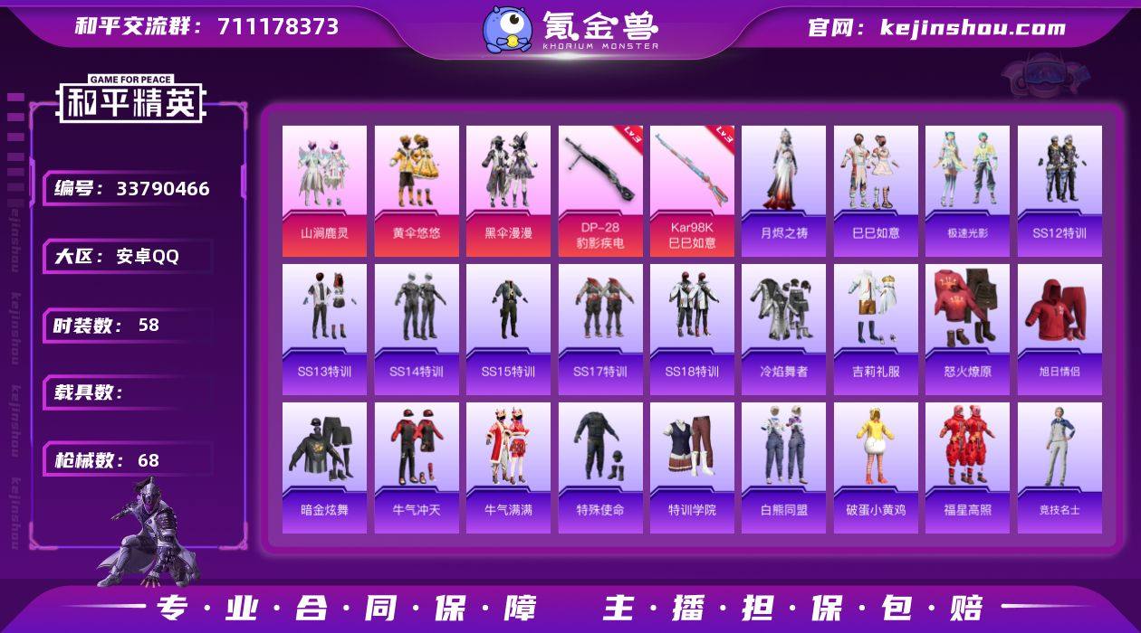安卓 手Q-3粉装-2特效枪-0载具-1粉色飞行器-19032热力值-5王牌印记-58套装-68枪皮 【粉色套装】:粉装-山涧鹿灵,粉装-黄伞悠悠,粉装-黑伞漫漫 【粉色枪皮等级】:Kar98K-巳巳如意(三级),DP-28-豹影疾电(三级) 【粉色枪皮】:Kar98K-巳巳如意,DP-28-豹影疾电 【粉色飞行器】:炫彩糖果飞行器 【粉色降落伞】:香水柠檬降落伞,星之彼岸降落伞,洛神天依降落伞,炫彩糖果降落伞 【稀有套装】:套装-巳巳如意,套装-炫彩糖果,套装-极速光影,角色-月烬之祷 【稀有枪皮】:AUG-冰晶雪宝,AKM-夜灯,AKM-星之彼岸,AKM-萌趣颜团子,SCAR-L-炫彩节奏,GROZA-治愈之星,M762-彩虹符号,M762-牛气冲天,Mk47-林间仙鹿,Mk47-洛神天依,AC-VAL-天降萌叽,UZI-啾咪啾咪,UZI-炫彩节奏,UMP45-蓝色火焰,Vector-彩虹符号,Vector-治愈之星,P90-巳巳如意,Kar98K-彩虹符号,Kar98K-欢乐麻酱,M24-治愈之星,VSS-虎痴许褚,Mini14-林间仙鹿,Mk14-治愈之星,Mk14-红伞翩翩,S686-巳巳如意,S1897-炫光贝贝,S1897-红伞翩翩,S12K-幻世战舞者,DBS-彩虹符号,M249-星之彼岸,MG3-幻世战舞者,短管霰弹-竹节火铳,破片手榴弹-巳巳如意 【其他套装】:套装-SS12特训,套装-SS13特训,套...